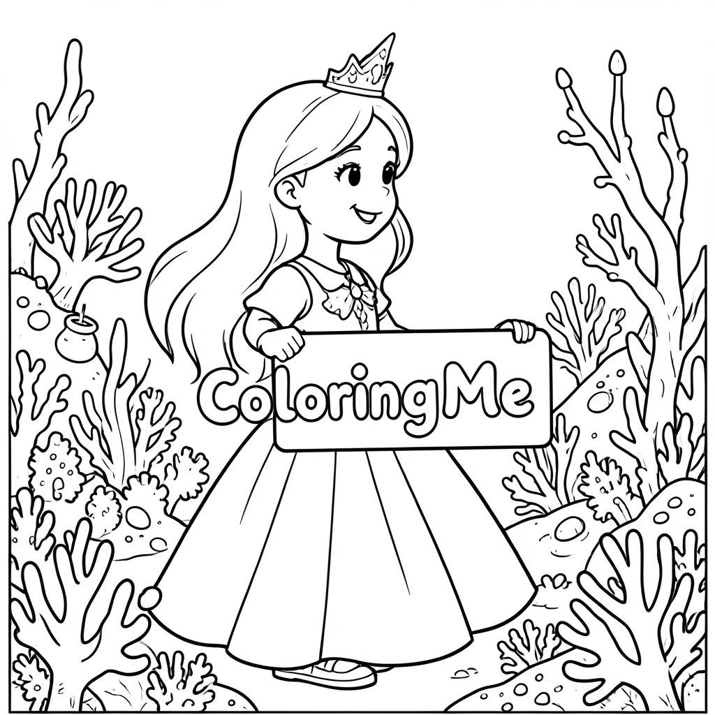 Ảnh chụp hồ sơ của một nàng công chúa thân thiện, cầm một tấm biển có dòng chữ "ColoringMe" được viết bằng chữ bong bóng màu trắng, trong hồ sơ, trong vương quốc rạn san hô dưới nước, theo phong cách siêu thực