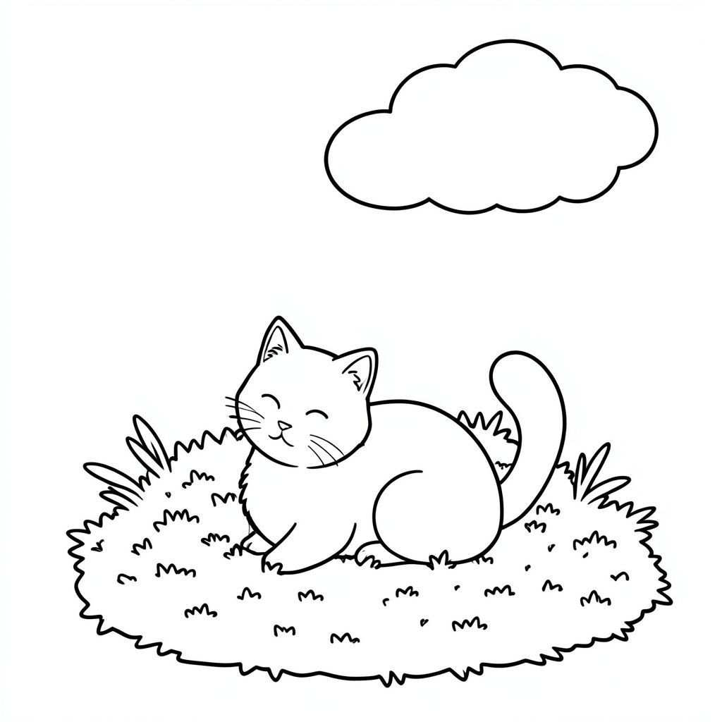 Ánh sáng mặt trời sưởi ấm một mảng rêu. Một con mèo trắng duy nhất ngồi nép mình giữa . Một đám mây nhỏ, nhẹ nhàng trôi dạt phía trên. Đuôi mèo hơi cong., tô màu, nghệ thuật đường nét, nền trắng