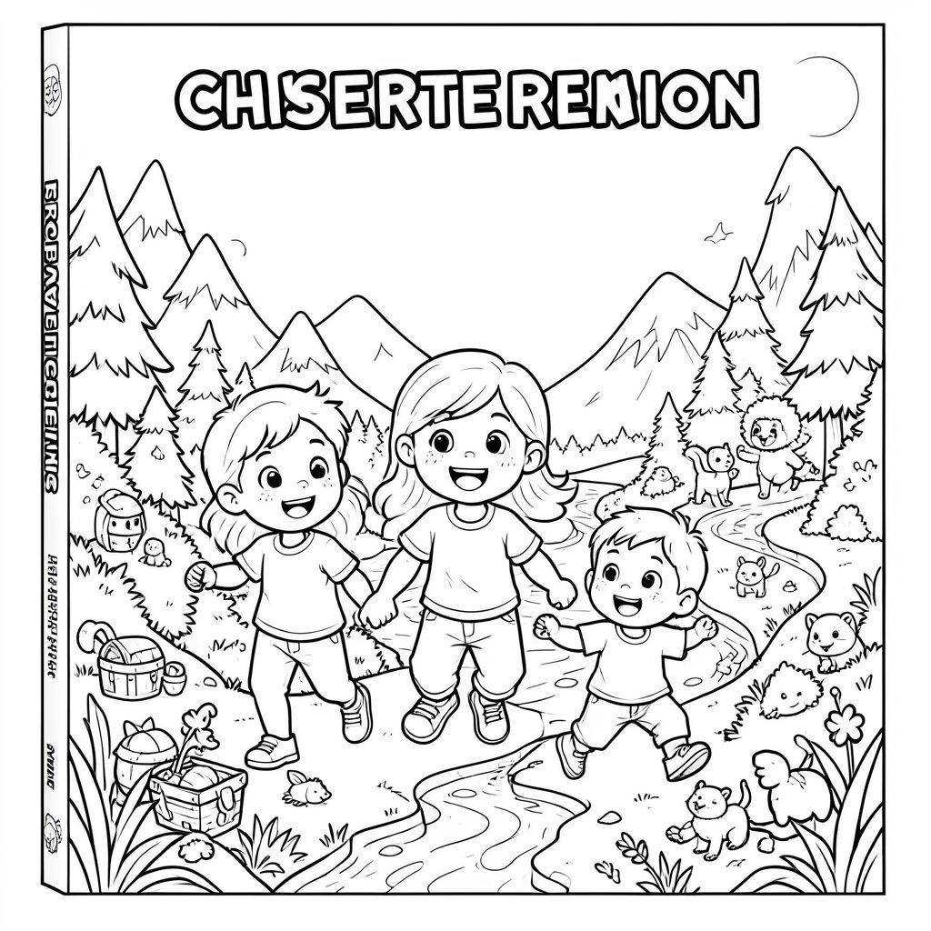 Minh họa ba nhân vật chính của trẻ em (đa dạng và biểu cảm: một bé trai, một bé gái và một bé nhỏ) cùng nhau tham gia vào một cuộc phiêu lưu thú vị. Họ đang khám phá một cảnh quan kỳ diệu chứa đầy các yếu tố thú vị như rừng, núi, sông, kho báu ẩn giấu, động vật dễ thương và những con đường bí ẩn. Những đứa trẻ nên trông tò mò, dũng cảm và hạnh phúc. Phong cách phải rõ ràng là nghệ thuật đường nét đen trắng phù hợp để tô màu (không đổ bóng, đường viền đậm, thân thiện với trẻ em). Để lại khoảng trống cho một tựa game lớn ở trên cùng.