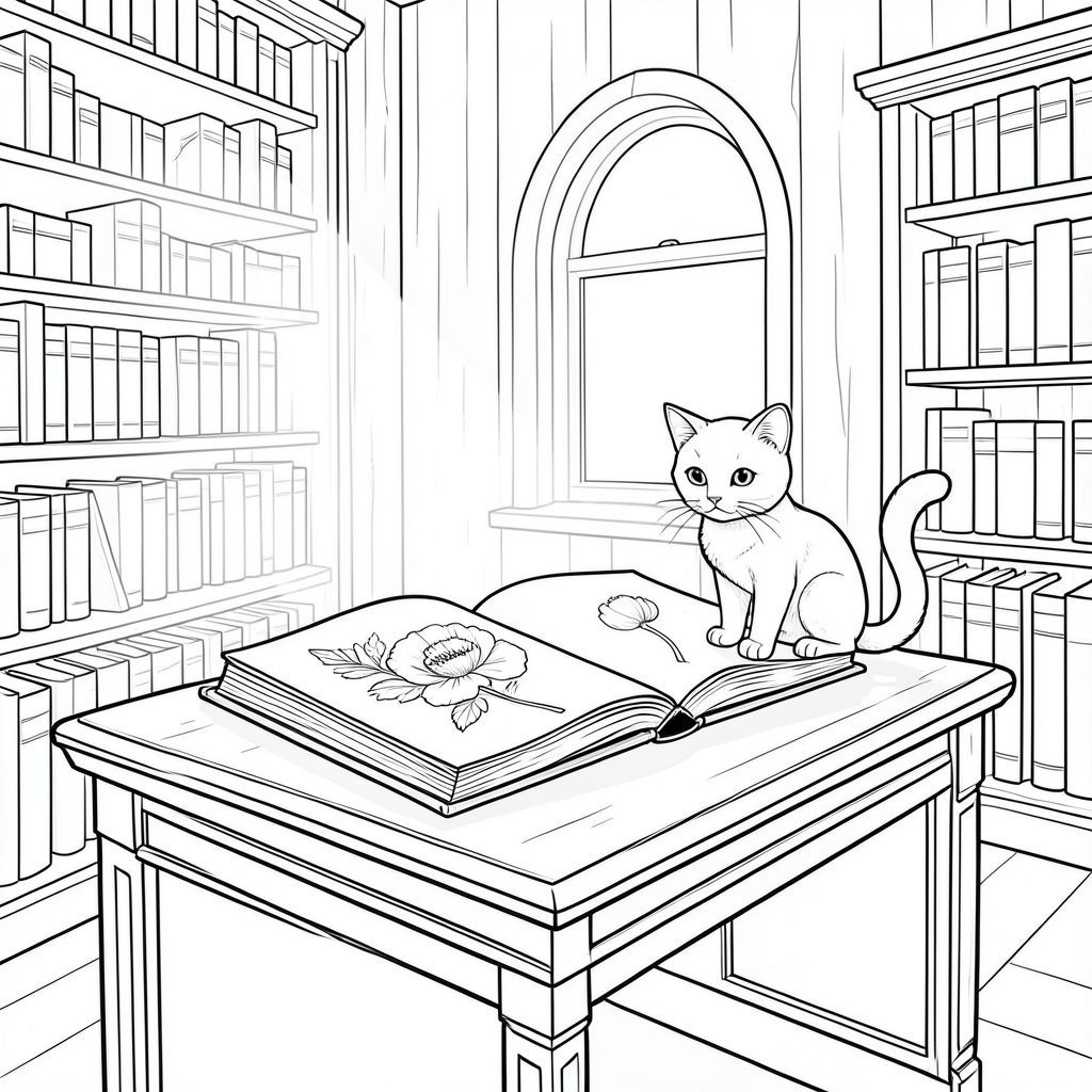 Một con mèo sứ nhỏ, có hình dạng hoàn hảo, một màu của, ngồi đậu trên mép bàn, đuôi cong thanh lịch. Khuôn mặt của nó là một biểu cảm thanh thản, gần như u sầu, một đường cong tinh tế của mũi gợi lên sự chiêm ngưỡng yên tĩnh. Bộ lông của mèo đồng đều, mượt mà, bắt với ánh sáng lung linh nhẹ nhàng. Nó được đặt hơi lệch tâm, nghiêng về phía người xem, như thể đang quan sát thứ gì đó không nhìn thấy. Nền là một ấn tượng hơi mờ của tấm ốp gỗ cũ kỹ, với một cửa sổ hình vòm đơn, hẹp, đóng khung bầu trời u ám, trầm lặng., trang màu, nghệ thuật đường nét, nền trắng