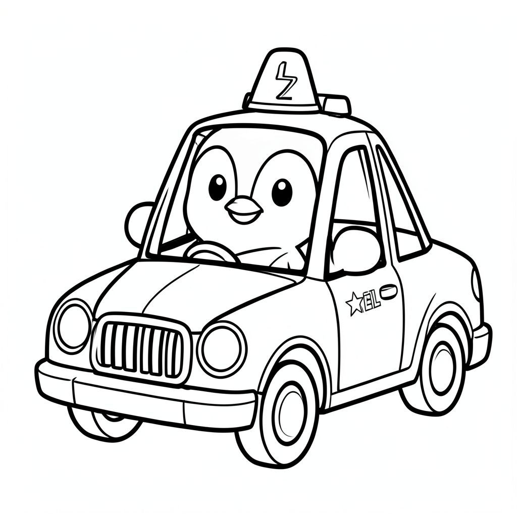 Chim cánh cụt nhỏ lái xe cảnh sát, hình còi báo động đơn giản, đường đậm dày, trắng và đen