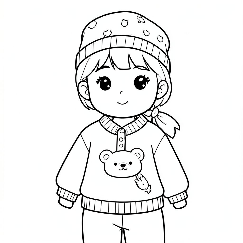cô gái ghible, mặc jumper dễ thương hình gấu, đội hat có họa tiết đơn giản, tóc thắt nơ, belt