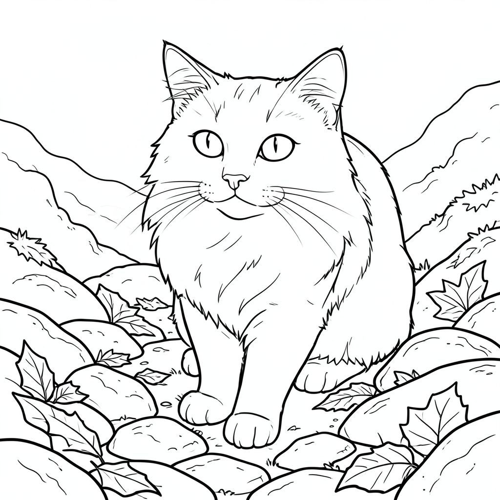 Bạn có muốn tôi giải thích chi tiết về bất kỳ khía cạnh cụ thể nào của mô tả này, có thể tập trung vào kết cấu đá hoặc tư thế của con mèo không?, trang màu, nghệ thuật đường nét, nền trắng