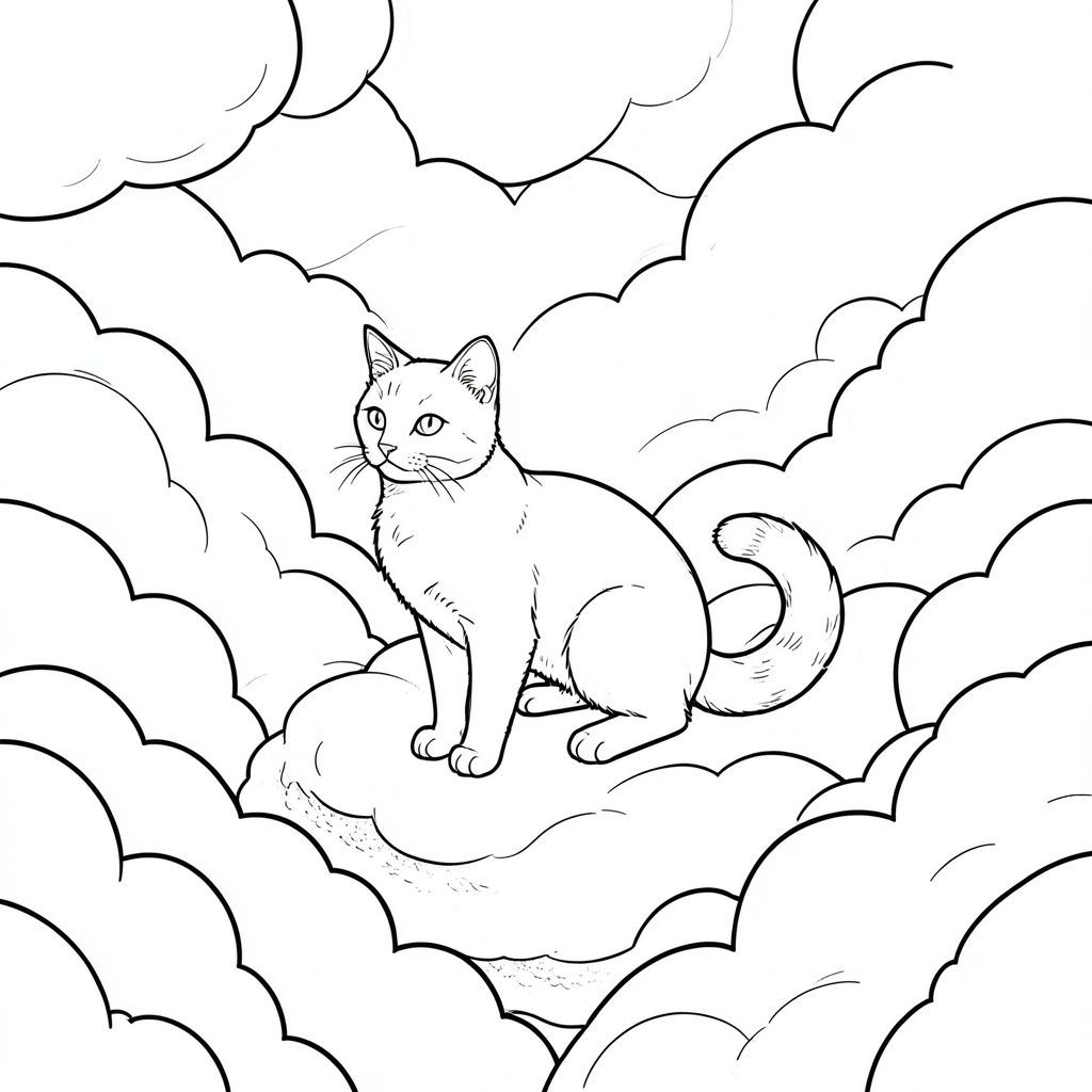 Ở trung tâm của khung cảnh đám mây này, một con mèo duy nhất, được kết xuất hoàn hảo được định vị. Đó là một con mèo lông ngắn, bóng bẩy, cao khoảng 6 inch. Con mèo hơi quay mặt sang trái, với biểu cảm dịu dàng, gần như u sầu. Bộ lông của nó rất phong phú, , với các biến thể tinh tế trong tông màu bắt chước kết cấu của các đám mây. Đầu của con mèo hơi nghiêng, như thể đang quan sát điều gì đó bên ngoài người xem. Đôi mắt của nó to và , với một ánh sáng tinh tế, thông minh. Tai nhọn và có hình dạng tinh tế, phản chiếu .