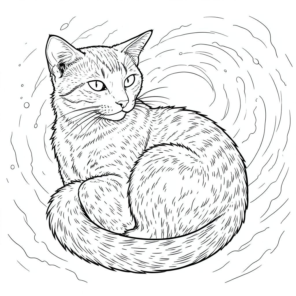 Bạn có muốn tôi giải thích chi tiết về bất kỳ khía cạnh cụ thể nào của mô tả này, có thể tập trung vào một chi tiết cụ thể của bộ lông mèo hoặc thành phần của tinh vân không?, trang màu, nghệ thuật đường nét, nền trắng