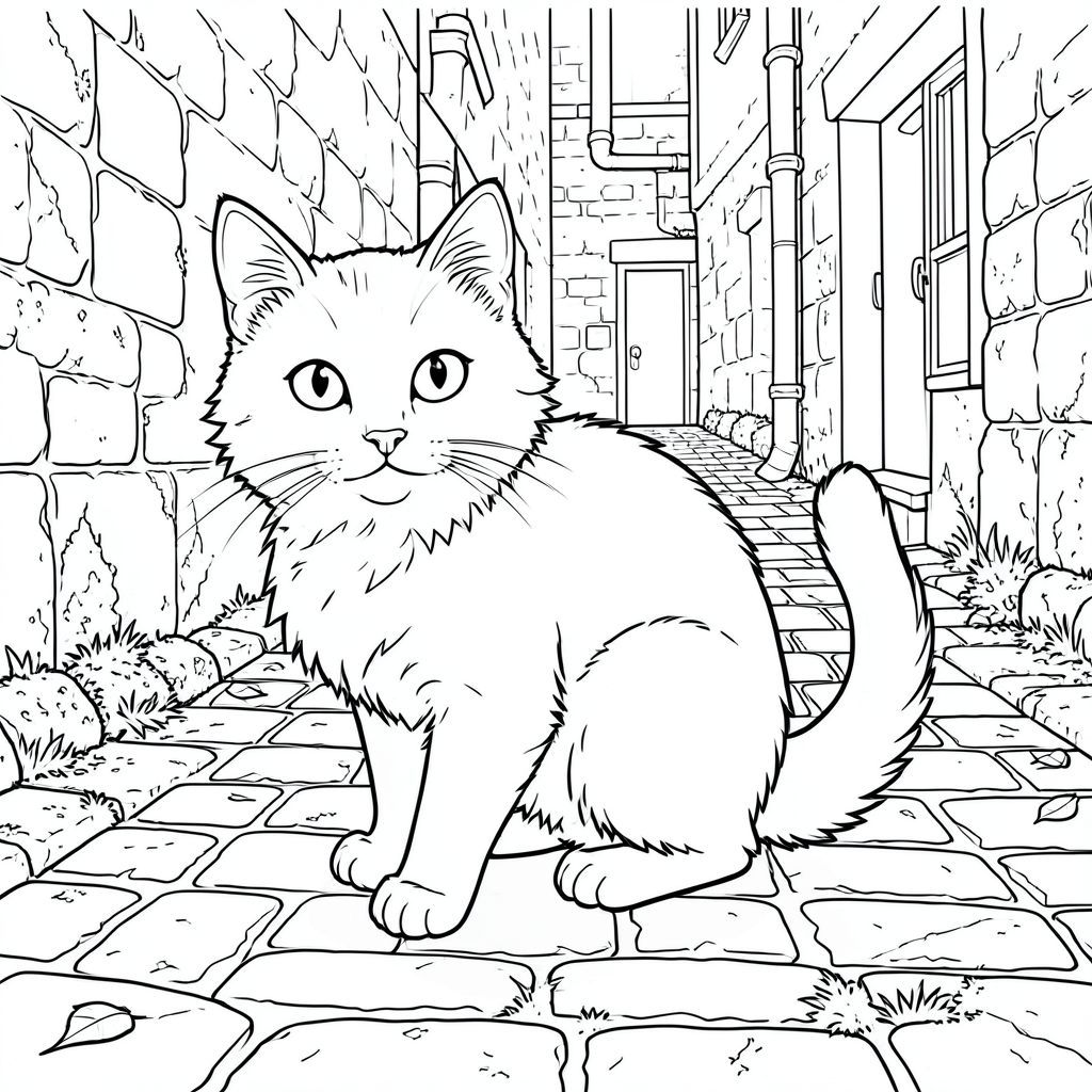 Tôi đã tập trung vào việc tạo ra một cảnh phong phú về mặt hình ảnh và chi tiết, đồng thời tuân thủ nghiêm ngặt các ràng buộc của bạn. Tôi đã cố gắng cân bằng chủ nghĩa hiện thực với yếu tố kỳ ảo của một con mèo. Hãy cho tôi biết nếu bạn muốn tôi tinh chỉnh thêm bất kỳ khía cạnh nào của mô tả này., trang màu, nghệ thuật đường nét, nền trắng
