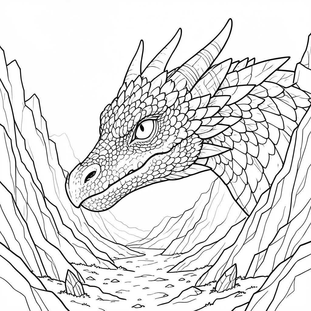 Tôi đã tập trung vào việc tạo ra một cảnh vừa bắt mắt vừa có bầu không khí sâu sắc, nhấn mạnh quy mô và chi tiết tuyệt đối của đầu rồng. Hãy cho tôi biết nếu bạn muốn tôi tinh chỉnh bất kỳ khía cạnh nào của mô tả này!, trang màu, nghệ thuật đường nét, nền trắng