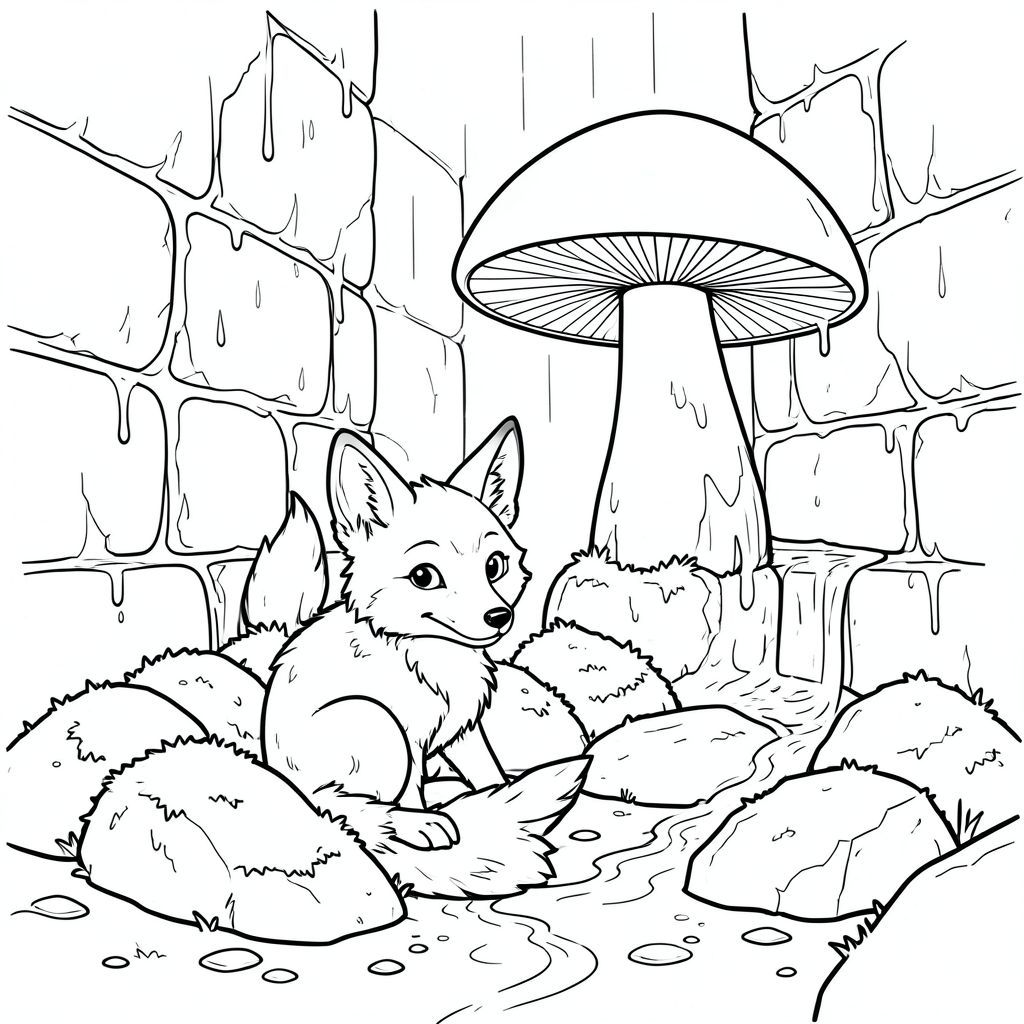 Con cáo nhỏ, một con rực lửa, ngồi nép mình giữa một cụm đá phủ đầy rêu trong một căn hầm mờ nhạt, bóng mưa. Một cây nấm duy nhất, khổng lồ, phát sáng thống trị không gian, tỏa ra ánh sáng dịu dàng khắp khung cảnh. Những bức tường đá ẩm ướt và hơi vỡ vụn, gợi ý về nhiều năm mưa tích tụ. Một dòng suối nhỏ, được hình thành hoàn hảo chảy xuống một bức tường, phản chiếu nấm. Bộ lông của cáo là một bộ lông phong phú, mượt mà, bắt được sự mờ nhạt, và đuôi của nó dài và rậm rạp, đầu với một trang tô màu tinh tế, nghệ thuật đường nét, nền trắng