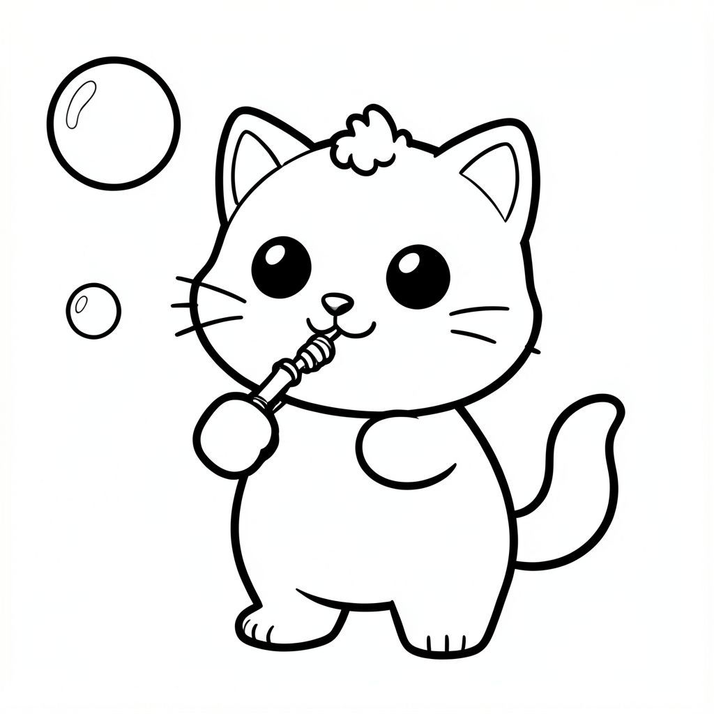 Con mèo con thổi bong bóng với một cây đũa bong bóng nhỏ cầm trên tay, một vài bong bóng tròn lớn trôi nổi gần đó. Tay phải sạch, rõ ràng và có thể nhìn thấy được.