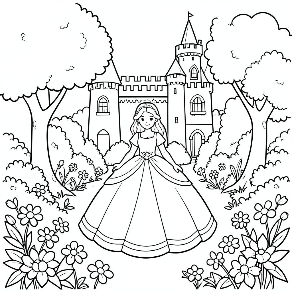 Công chúa trong một khu vườn lâu đài, xung quanh cây và bụi hoa nghệ thuật đường nét đen trắng đơn giản cho trẻ em "