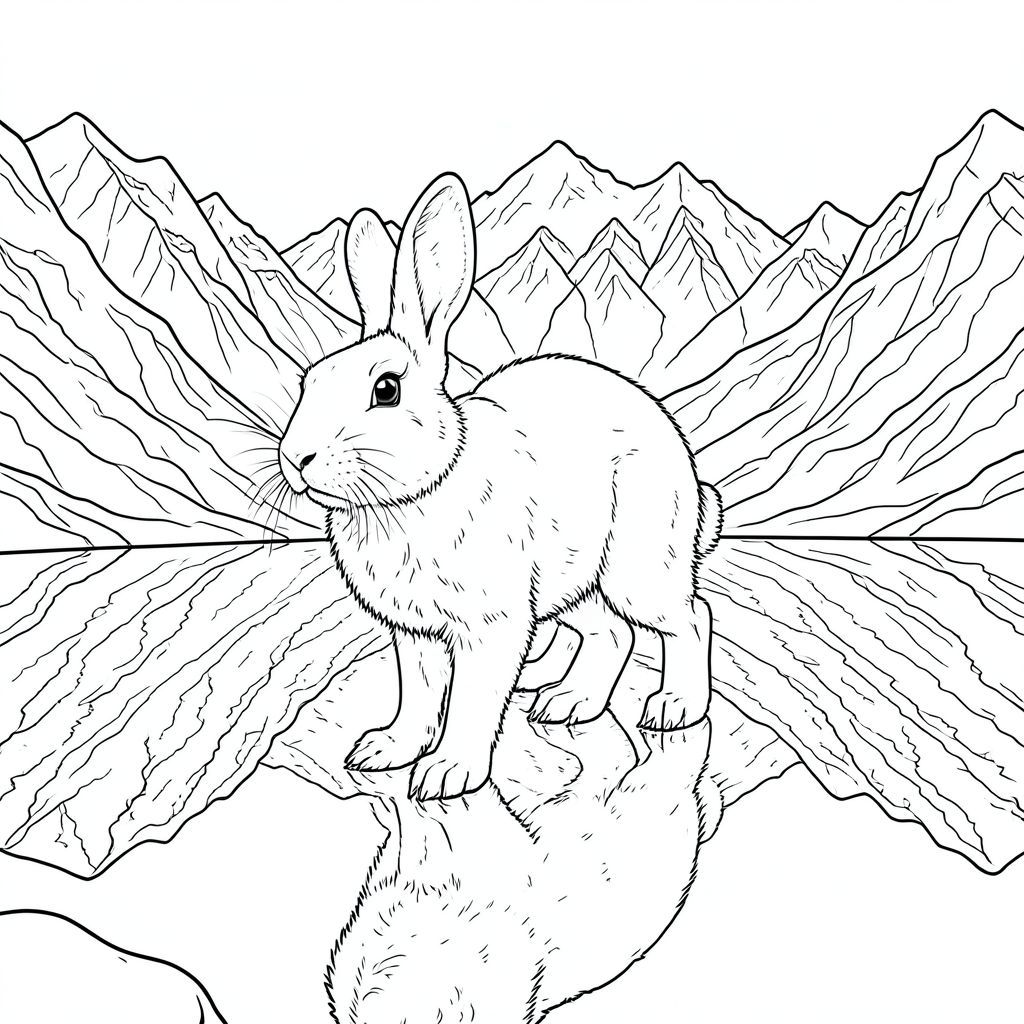 Thành phần tổng thể được cân bằng cẩn thận, với thỏ đóng vai trò là tâm điểm. Sự tương phản rõ rệt giữa thỏ trắng và nền có kết cấu tạo ra cảm giác cô lập và hùng vĩ. Việc thiếu bóng và màu sắc tạo cảm giác vượt thời gian và quy mô khổng lồ. Không gian âm: Hình ảnh được lấp đầy bởi một lượng không gian trắng đáng kể, cho phép mắt người xem đi lang thang qua cảnh. Các yếu tố chính cần nhấn mạnh: * Bộ lông, đá và tuyết đều được hiển thị với độ chi tiết cực kỳ cao để tạo cảm giác chân thực, xúc giác. * Sự phản chiếu trong hồ tạo ra những điểm nổi bật và bóng tối tinh tế xác định hình dạng của thỏ rừng. * Con thỏ được thể hiện như một nhân vật lớn, hùng vĩ trong phong cảnh, nhấn mạnh sự hiện diện của nó.