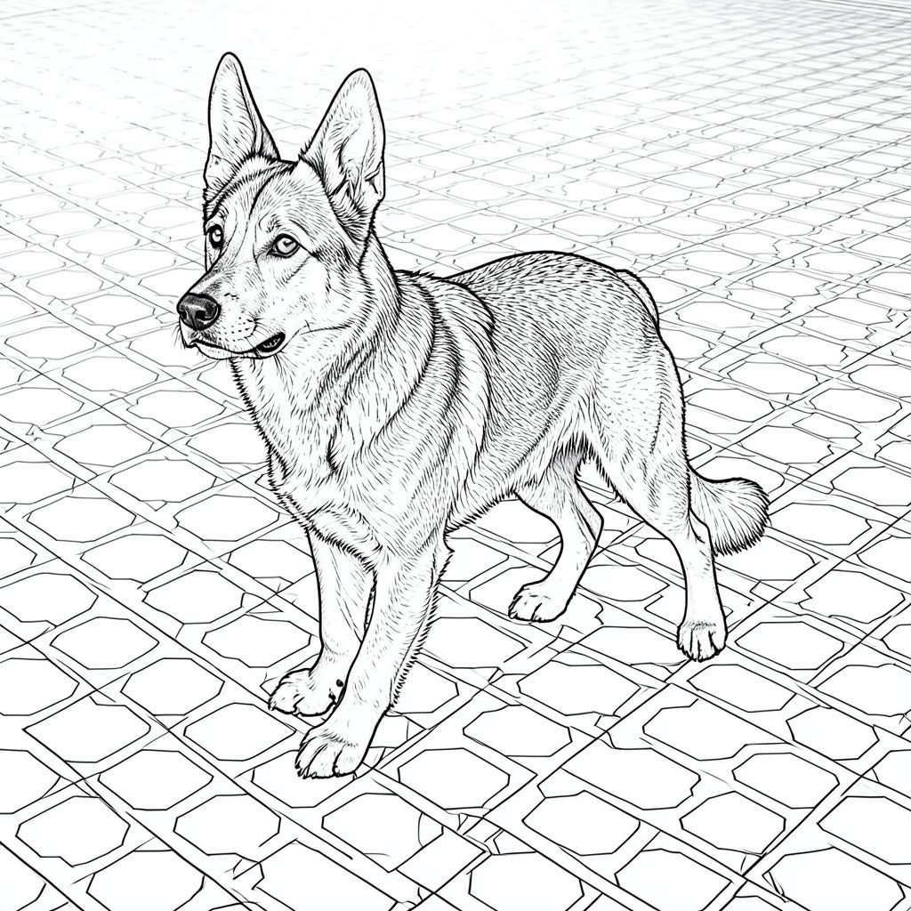 Tâm điểm là một duy nhất, được kết xuất hoàn hảo. Đó là một giống chó có kích thước trung bình - có lẽ là hỗn hợp chó chăn cừu Đức - với thân hình hơi gầy, cơ bắp. hơi quay mặt sang trái, với biểu cảm tập trung, cảnh giác. Bộ lông của nó dày đặc, ngắn và hơi thô . Bộ lông được thể hiện với một chi tiết rất mịn, gần như cực nhỏ, nhấn mạnh các sợi riêng lẻ. Đầu của hơi nghiêng, truyền tải cảm giác quan sát. Đôi mắt của nó là một màu thông minh, được đặt trong mõm. Mũi là một , trông hơi ướt . Miệng là một đường nét tinh tế, hơi tách ra, gợi ý về một ánh mắt lặng lẽ, cảnh giác.