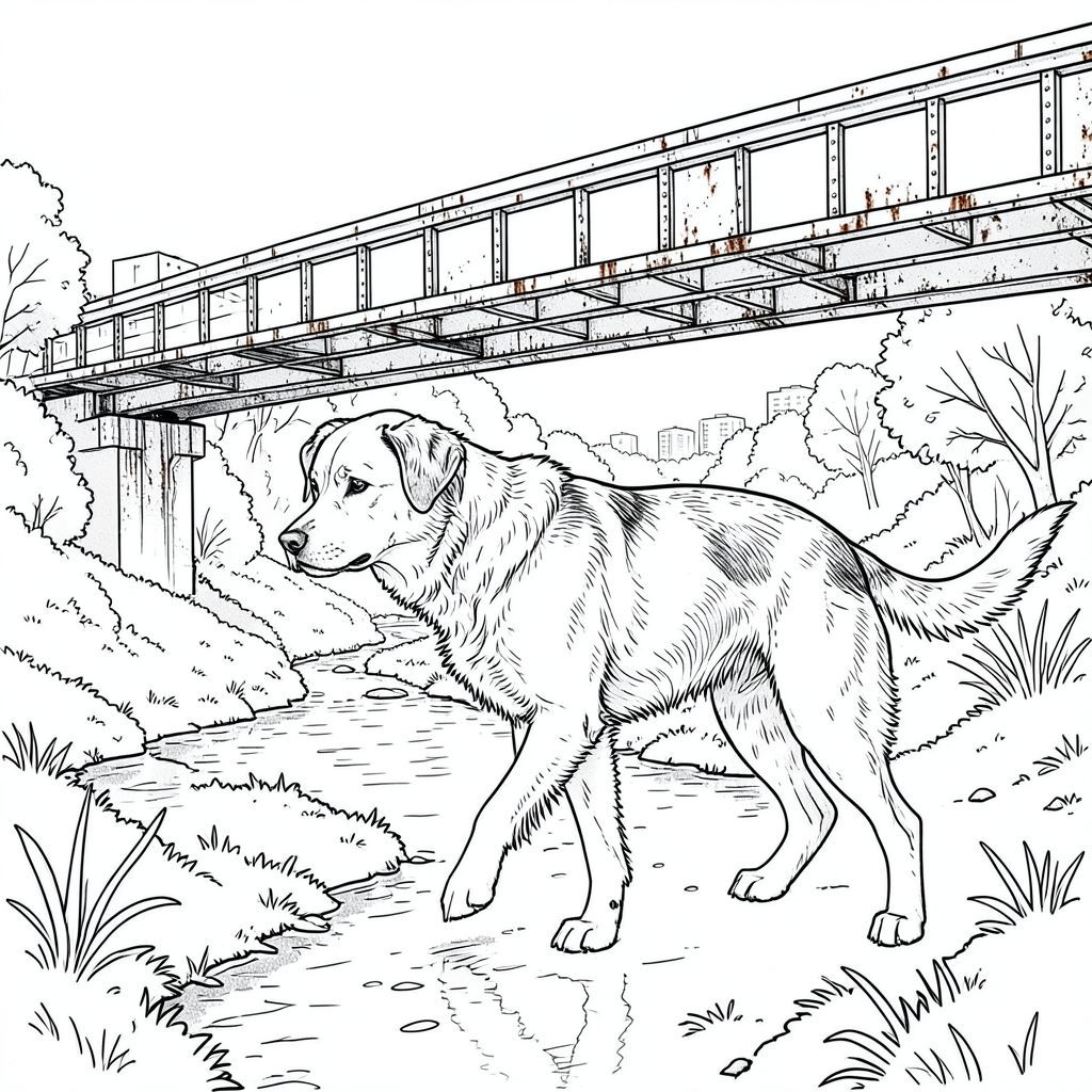 của hình ảnh, nhằm đáp ứng tất cả các yêu cầu và tạo ra một hình minh họa thực sự chi tiết, thang độ xám và trắng. Tôi sẽ tập trung vào việc truyền tải cảnh qua các đường nét chính xác và cảm giác có chiều sâu. Mô tả hình ảnh: Hình ảnh là một hình minh họa màu trắng, gần như nhiếp ảnh và tập trung vào một cây cầu vượt đường cao tốc. Cầu vượt là một kết cấu thép hiện đại, hơi phong hóa, có thể nhìn thấy các đường nối và rỉ sét ở nhiều nơi, cho thấy tuổi tác và độ phơi sáng. Nó được đặt ở một góc nhỏ, nhìn về phía một dòng suối chảy nhẹ nhàng uốn lượn qua một thung lũng nhỏ, xanh tươi. Dòng suối không phải là một dòng chảy xiết, mà là một dải nước chậm, uốn lượn, phản chiếu bầu trời u ám.