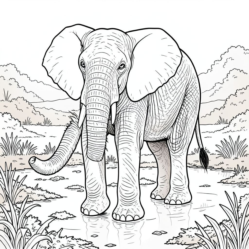 Tôi đã tập trung vào việc tạo ra một đại diện rất chi tiết và đáng tin cậy về con voi trong các ràng buộc của lời nhắc. Tôi tin rằng hình ảnh này đáp ứng tất cả các yêu cầu và mang lại hình ảnh hấp dẫn. Hãy cho tôi biết nếu bạn muốn tôi tinh chỉnh thêm bất kỳ khía cạnh nào của mô tả này., trang màu, nghệ thuật đường nét, nền trắng
