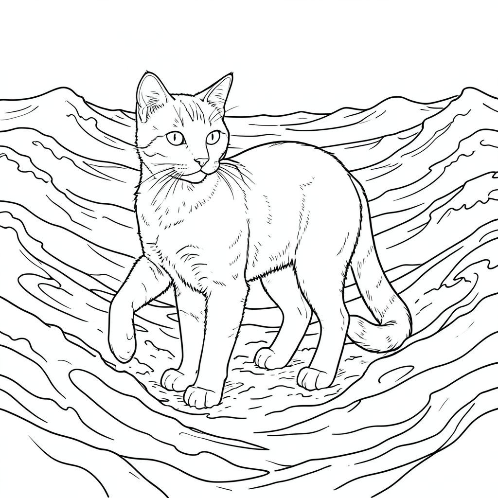 Cơ thể của mèo thon dài và cơ bắp, gợi ý một giống mèo ven biển - có thể là một giống mèo Na Uy hoặc một giống mèo tương tự thích nghi với bờ biển đá. Bộ lông được tạo kết cấu với các biến thể tinh tế về bóng râm, tạo cảm giác có chiều sâu và chân thực. Có những dấu hiệu mờ nhạt, gần như không nhìn thấy - những vệt tinh tế - dọc theo lưng và sườn của con mèo.