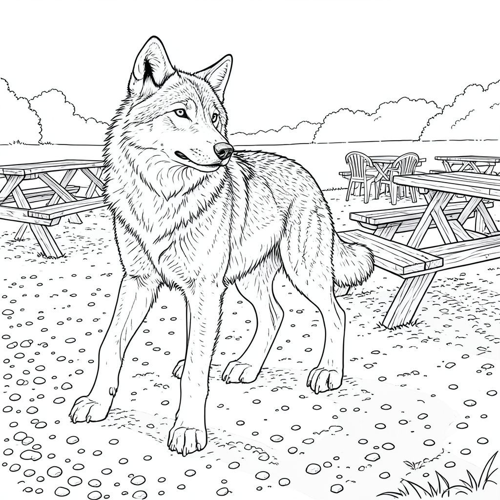 Bối cảnh cực kỳ chi tiết. Có một số bàn dã ngoại, được xây dựng bằng gỗ phong hóa, được sắp xếp thành hình bán nguyệt. Một số hơi nghiêng, tạo thêm cảm giác chuyển động. Có thể nhìn thấy một vài chiếc ghế nhựa nằm rải rác, được sắp xếp gọn gàng và một chiếc khăn trải bàn ca rô nhỏ, hơi sờn. Sỏi là sự pha trộn của và, với những viên sỏi nhỏ và các mảnh đất nhúng bên trong. Có một đường mờ, tinh tế của một cái cây thường xanh ở xa, hơi mờ, ở hậu cảnh rất xa. Ấn tượng tổng thể là một trong những không gian ngoài trời được duy trì tốt, hơi mộc mạc. Các chi tiết chính cần nhấn mạnh: * Tinh khiết và trắng. * Yếu tố quan trọng nhất - bộ lông cần phải cực kỳ chi tiết, với cảm giác kết cấu mạnh mẽ. * Phải mềm mại và có hướng, tạo bóng mạnh và làm nổi bật các đặc điểm của sói. * Con sói được đặt ở vị trí trung tâm, thu hút ánh nhìn của người xem.