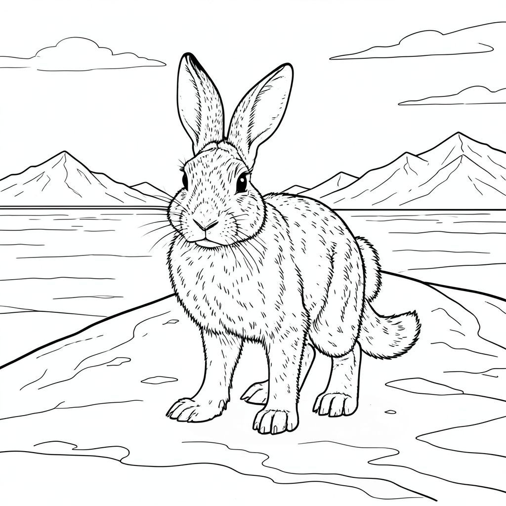 Ở trung tâm của khung cảnh, một con thỏ lớn, phủ đầy tuyết đứng nổi bật. Nó được đặt hơi lệch tâm, nghiêng về phía người xem. Đầu thỏ rừng là tâm điểm và nó được hiển thị với độ chi tiết đáng kinh ngạc. Đầu có hình bầu dục gần như vậy, với độ dốc nhẹ, thoai thoải lên đỉnh. Bộ lông dày và dày, tạo ra một bề mặt có kết cấu. Tai to, hình tam giác và nhọn, có một đường cong nhẹ. Đôi mắt được thiết lập và , với một lông mày tinh tế, hơi nhô lên. Mũi nhỏ và cùn. Mõm hơi dài. Bộ lông trên mặt là sự pha trộn của màu trắng và màu trắng, tạo nên một hoa văn tinh tế. Chân của thỏ rừng dài và mạnh mẽ, kết thúc bằng bàn chân lớn, xòe ra. Mỗi bàn chân có hình dạng hơi cong riêng biệt. Đuôi thỏ dài, dày và rậm rạp, cong lên trên và hơi lùi về phía sau. Đó là một màu sắc phong phú, với một chút ánh sáng cho nó. Đầu đuôi hơi sờn.