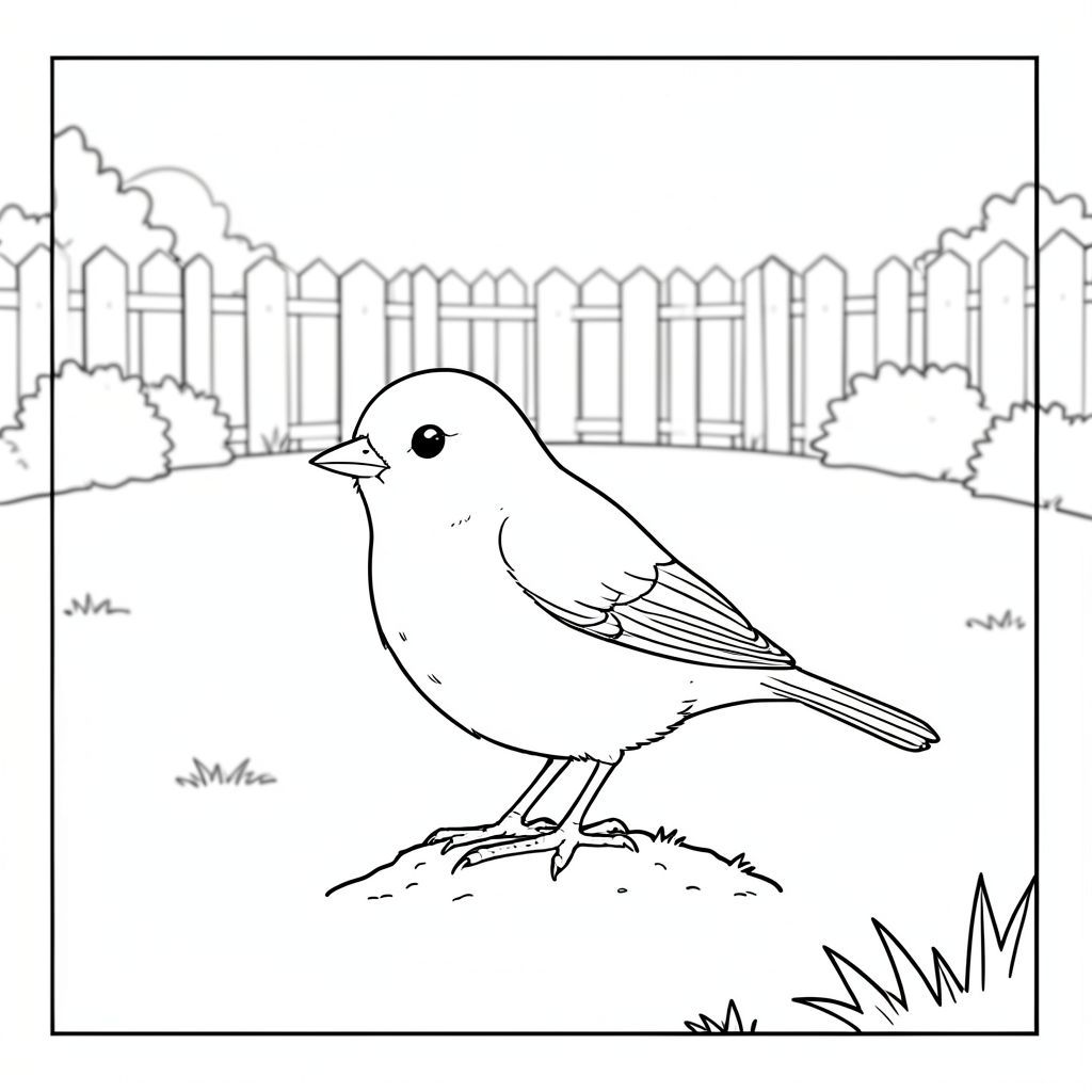 của một màu trắng tinh khiết có một con chim duy nhất, theo thông số kỹ thuật chi tiết của bạn. Tôi sẽ tập trung vào việc tạo ra một khung cảnh thanh bình, đơn giản. Mô tả hình ảnh: Là một khu vực hình chữ nhật lớn, khoảng 20cm x 30cm. Hậu cảnh là một sân sau ngoại ô hơi mờ, ấm áp, ngập tràn ánh nắng. Đó là một bãi cỏ đơn giản, hơi nhấp nhô, chủ yếu được bao phủ bởi cỏ. Một hàng rào gỗ nhỏ, phong hóa chạy dọc theo rìa sân, với một vài cây bụi thấp, nhiều lá có thể nhìn thấy ở hậu cảnh. Mặt trời được đặt trên bầu trời, tỏa ra một ánh sáng ấm áp, nhẹ nhàng trên khung cảnh. Có một gợi ý về một mảng cỏ sẫm màu hơn một chút gần góc dưới cùng bên phải, gợi ý một chút .