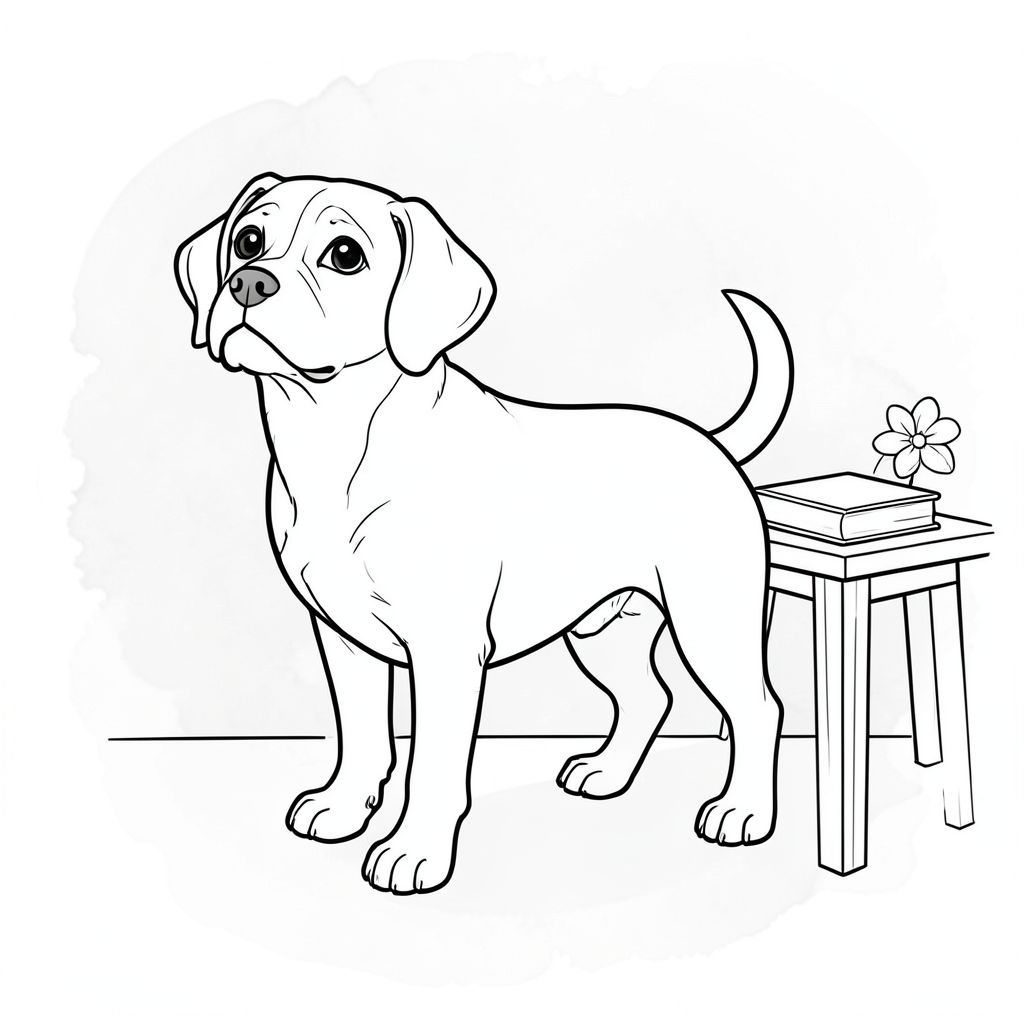 Ở trung tâm của , một duy nhất, được kết xuất hoàn hảo được định vị. là một giống chó có kích thước trung bình - hãy nghĩ đến sự kết hợp giữa một săn và một con - với mõm hơi dài và đôi mắt thông minh, biểu cảm. hơi quay mặt sang trái, đầu hơi hướng lên trên, nhìn về phía người xem. Bộ lông của nó mịn màng, có màu sắc, với những biến thể tinh tế về tông màu gợi ý một kết cấu tự nhiên. Đuôi của hơi cong lại, tạo thêm đường cong nhẹ nhàng cho hình ảnh. Nó được định vị sao cho cơ thể chó hơi nghiêng, tạo cảm giác chuyển động năng động.
