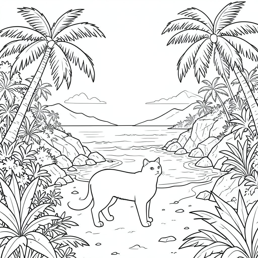 Độc lập, động vật đơn, bốn chân, một đầu, một đuôi, đúng giải phẫu, con mèo, Cây dừa, Tán lá rậm rạp, đồng bằng ven biển nhiệt đới, Mở rộng, ánh sáng mặt trời, , đại dương, Nước, cát trắng, Vách đá, Đá phong hóa, , Cây xanh tươi tốt, Cành cây đung đưa, bầu trời quang đãng, những ngọn núi xa xôi, ấm áp, cát kết cấu, nước nông, sóng, gió nhẹ, biển lặng, màu sắc, chế độ xem toàn cảnh, mở rộng, phong cảnh thiên nhiên, bình dị, yên bình, Thanh thản,, trang tô màu, nghệ thuật đường nét, nền trắng, trang màu, nghệ thuật đường, nền trắng, Lời nhắc tiêu cực: hai đầu, hai đầu, thêm đầu, hai đuôi, thêm đuôi, hai thân cây, thêm thân cây, năm chân, thêm chân, ba chân, sáu chân, ba cánh, thêm cánh, đột biến, biến dạng, giải phẫu xấu, thêm chi, hợp nhất, dính, trùng lặp, nhiều động vật, nhiều đối tượng, bảng nhân vật, xấu xí, bệnh hoạn, đột biến, biến dạng, tứ chi dị dạng, quá nhiều chân, quá nhiều đuôi