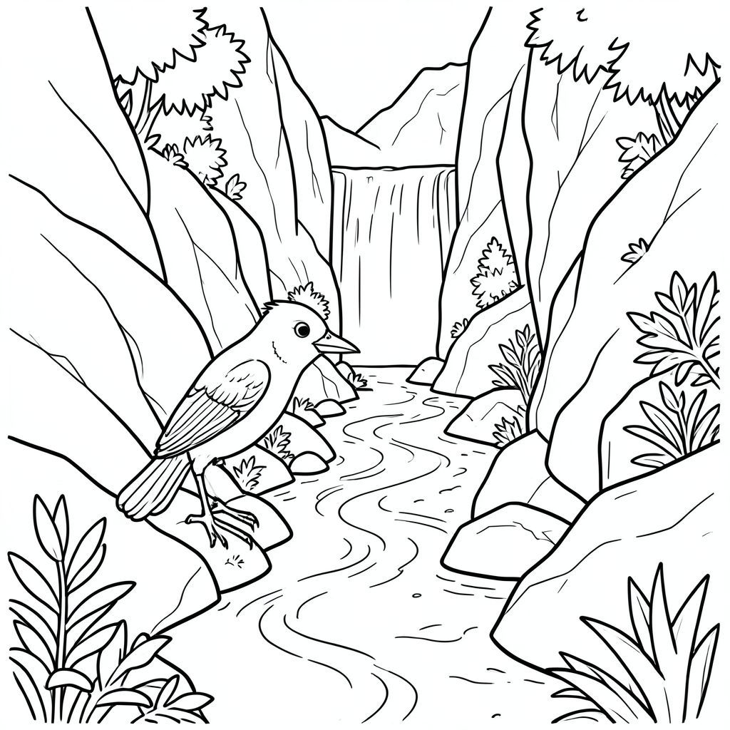 Độc lập, một con chim, một đầu, hai mắt, một mỏ, hai cánh, hai chân, một đuôi, tỷ lệ tự nhiên, quy mô thích hợp trong môi trường, đúng giải phẫu, chim, suối núi, hẻm núi đá, nước xếp tầng, lối đi hẹp, đá, ánh sáng mặt trời, tán lá, độ sâu, phối cảnh, quanh co, trang màu, nghệ thuật đường, nền trắng, solo, chủ đề đơn, chính xác về mặt giải phẫu, giải phẫu hoàn hảo
