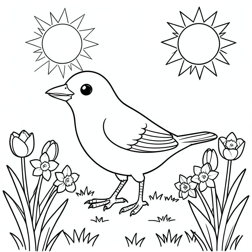 Độc mình, một con chim, một đầu, hai mắt, một mỏ, hai cánh, hai chân, một đuôi, tỷ lệ tự nhiên, quy mô thích hợp trong môi trường, đúng giải phẫu, chim, mặt trời, hoa, hoa tulip, hoa thủy tiên, vườn, hàng, nắng, cỏ, dọn dẹp, đơn giản, trang màu, nghệ thuật đường, nền trắng, solo, chủ đề đơn, chính xác về mặt giải phẫu, giải phẫu hoàn hảo