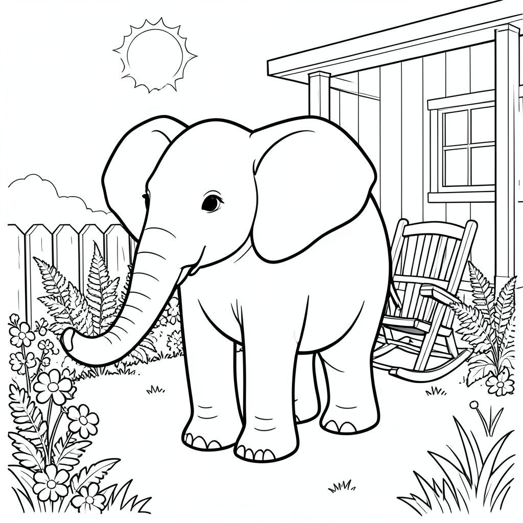 Độc mình, một con voi, một đầu, hai mắt, hai tai lớn, một thân cây, bốn chân, một đuôi, bàn chân trên mặt đất vững chắc, tỷ lệ tự nhiên, quy mô thích hợp trong môi trường, đúng về mặt giải phẫu, voi, hiên nhà có ánh nắng mặt trời, ghế bập bênh, dương xỉ, vườn, hoa, hàng rào gỗ, cỏ, lý lịch đơn giản, dọn dẹp, sách truyện, trang màu, nghệ thuật đường, nền trắng, solo, chủ đề đơn, đúng giải phẫu, giải phẫu hoàn hảo