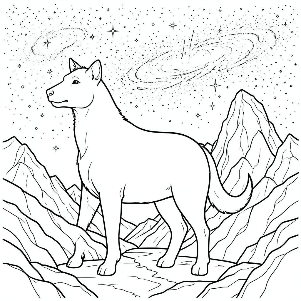 Độc thoại, chủ đề đơn, bốn chân, một đầu, một đuôi, đúng về mặt giải phẫu, thú vật, Thiên hà đầy sao rộng lớn, Bầu trời, Đỉnh núi đá, Môi trường chi tiết, thực tế, Thiên thể, Vũ trụ, Tinh vân, Cánh đồng sao, Dãy núi, Trang màu, Nghệ thuật đường, nền trắng, Solo, chủ đề đơn, Đúng về mặt giải phẫu, Giải phẫu hoàn hảo