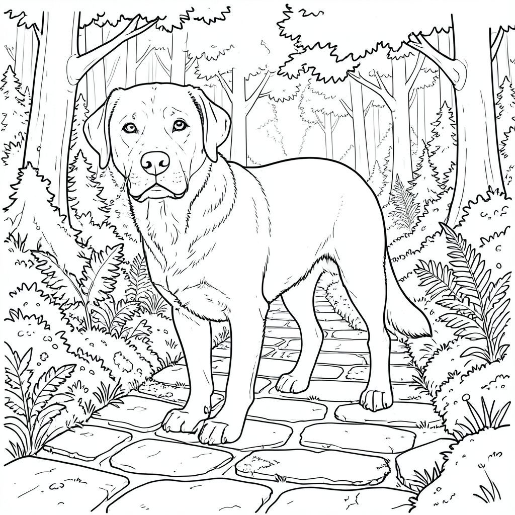 . Đối tượng: Một đơn, Labrador được đặt hơi nghiêng, đầu quay về phía người xem. Đó là một trưởng thành, khoảng 6 tuổi, với khuôn mặt hơi nhăn nheo và biểu cảm dịu dàng, thông minh. Bộ lông của nó rậm rạp, ngắn , giáp với một - dưới ánh sáng mặt trời. Bộ lông hơi mờ ở những nơi, đặc biệt là quanh cổ và gốc tai của nó. Chân của dài và vạm vỡ, kết thúc bằng bàn chân hơi dang rộng. Đuôi của nó dài và dày, hơi cong xuống dưới, và được giấu gọn gàng bên dưới cơ thể. Mũi của là một , ướt , và đôi mắt của nó là một , có hồn, với một ánh sáng lấp lánh nhẹ, hiểu biết. Có một vết sẹo tinh tế, gần như không thể nhận thấy ngay phía trên mắt trái của nó, một đường nhỏ. Ấn tượng tổng thể là một trong những phẩm giá yên tĩnh và một chút u sầu. Bối cảnh: Con đường đá phủ đầy rêu Hậu cảnh là một góc nhìn được hiển thị tỉ mỉ, hơi cao về một con đường đá hẹp, quanh co. Những viên đá có nhiều kích cỡ và kết cấu khác nhau - một số nhẵn và tròn, một số khác lởm chởm và không đều. Đá chủ yếu là một loại đất im lặng, với các mảng địa y và rêu mọc trong sắc thái của và . Con đường uốn cong nhẹ nhàng xuống dưới, biến mất vào một khu rừng rậm rạp. Mềm mại và khuếch tán, lọc qua tán cây phía trên, tạo hiệu ứng lốm đốm trên đá. Khu rừng bao gồm nhiều loại cây thường xanh - chủ yếu là cây sồi và cây phong - với mật độ dương xỉ cao và cây bụi mọc thấp. Ấn tượng tổng thể là một trong những sự yên tĩnh, vượt thời gian. Có một làn sương mù tinh tế ở phía xa, làm dịu các rìa rừng. Những viên đá hơi mòn và được bao phủ bởi một lớp rêu mịn, tạo cảm giác hữu cơ, có kết cấu. Bảng màu chủ đạo là nâu, xanh lá cây và xám, với các biến thể tinh tế về tông màu để bắt chước môi trường tự nhiên. Con đường hơi nứt ở nhiều nơi, làm tăng thêm cảm giác về tuổi tác và lịch sử., trang màu, nghệ thuật đường nét, nền trắng
