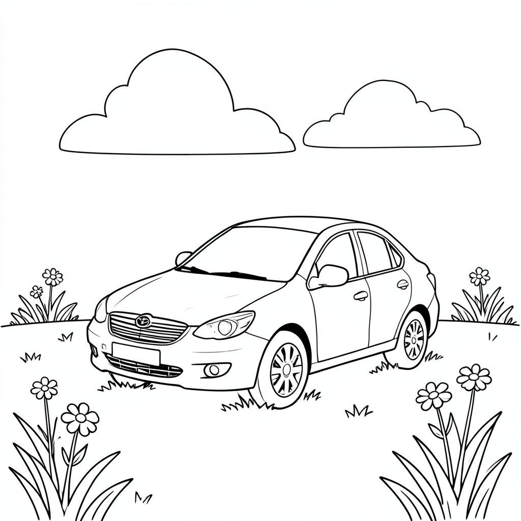 Đồng cỏ đầy nắng. Một chiếc xe màu trắng ngồi hơi nghiêng, phần đầu xe hơi hướng sang trái. Một đám mây mờ mịt, dịu dàng trôi dạt phía sau nó. Hậu cảnh là một bãi cỏ mềm mại với một vài bông hoa dại rải rác ở phía xa. Chiếc xe được căn giữa, được cân bằng bởi một đường cong tinh tế, hướng lên trên cỏ., trang màu, nghệ thuật đường nét, nền trắng