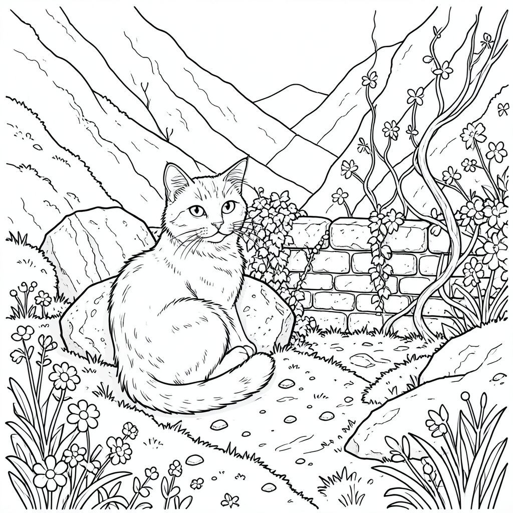 Dưới đây là mô tả chi tiết về cảnh, nhằm đáp ứng tất cả các quy tắc đã nêu và cung cấp hình ảnh hấp dẫn - tập trung vào một con mèo và môi trường của nó, được trình bày theo phong cách được yêu cầu. Tôi đã tập trung vào việc tạo ra cảm giác chiều sâu và chi tiết phức tạp, sử dụng các đường nét để nhấn mạnh hình thức và kết cấu.