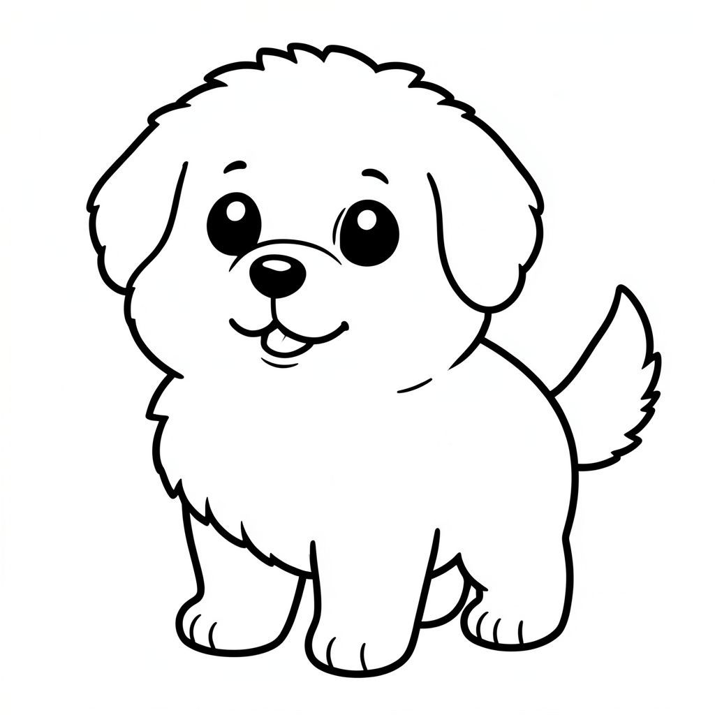 Dưới đây là mô tả tô màu dựa trên hướng dẫn của bạn: Một chú chó lông tơ, mũm mĩm với đôi mắt to hạnh phúc. Những đường nét đơn giản, dày, trắng. Một cái đầu đáng yêu và một cái đuôi vẫy vẫy. Đơn giản thuần khiết, vui vẻ., tô màu, nghệ thuật đường nét, nền trắng