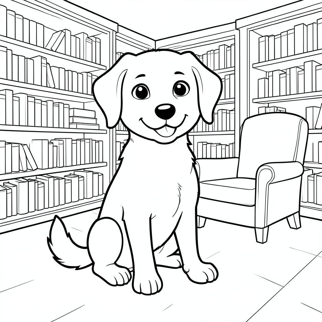 Dưới đây là mô tả tô màu, theo sau là yêu cầu tạo hình ảnh. Mô tả tô màu: Một chú chó vui vẻ, thân thiện ngồi kiên nhẫn trong một thư viện ấm cúng, đầy nắng. Giá sách đầy gai nằm dọc theo các bức tường và một chiếc ghế bành thoải mái nằm gần đó. có cái đuôi vẫy vẫy và biểu cảm ngọt ngào, chu đáo. Hoàn hảo cho các nghệ sĩ trẻ yêu động vật và đọc sách! Yêu cầu tạo hình ảnh: [HỆ THỐNG: CHẾ ĐỘ BÌNH THƯỜNG - CẢNH TRUYỆN]. Quy tắc: 1. VẼ ĐỐI TƯỢNG CHÍNH TRƯỚC. 2. THÊM MỘT NỀN ĐƠN GIẢN, PHÙ HỢP. THAY ĐỔI HÌNH NỀN. KHÔNG PHẢI LÚC NÀO CŨNG VẼ MÂY VÀ CỎ. 3. ĐƯỜNG NÉT SẠCH SẼ. 4. KHÔNG.