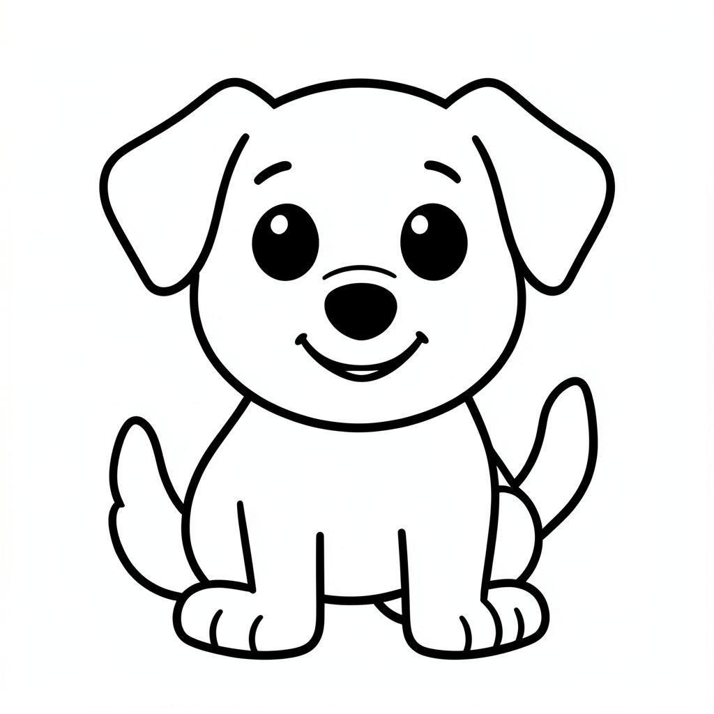 Một chú chó đơn giản, táo bạo, dễ thương. Khuôn mặt cười lớn, tròn. Đường dày, dày., tranh tô màu đen trắng, phong cách lowbook, nghệ thuật đường nét, đơn sắc, không màu, không đổ bóng, không xám, không tô màu, nền trắng, chỉ phác thảo, phong cách vector, thiết kế phẳng, 2d