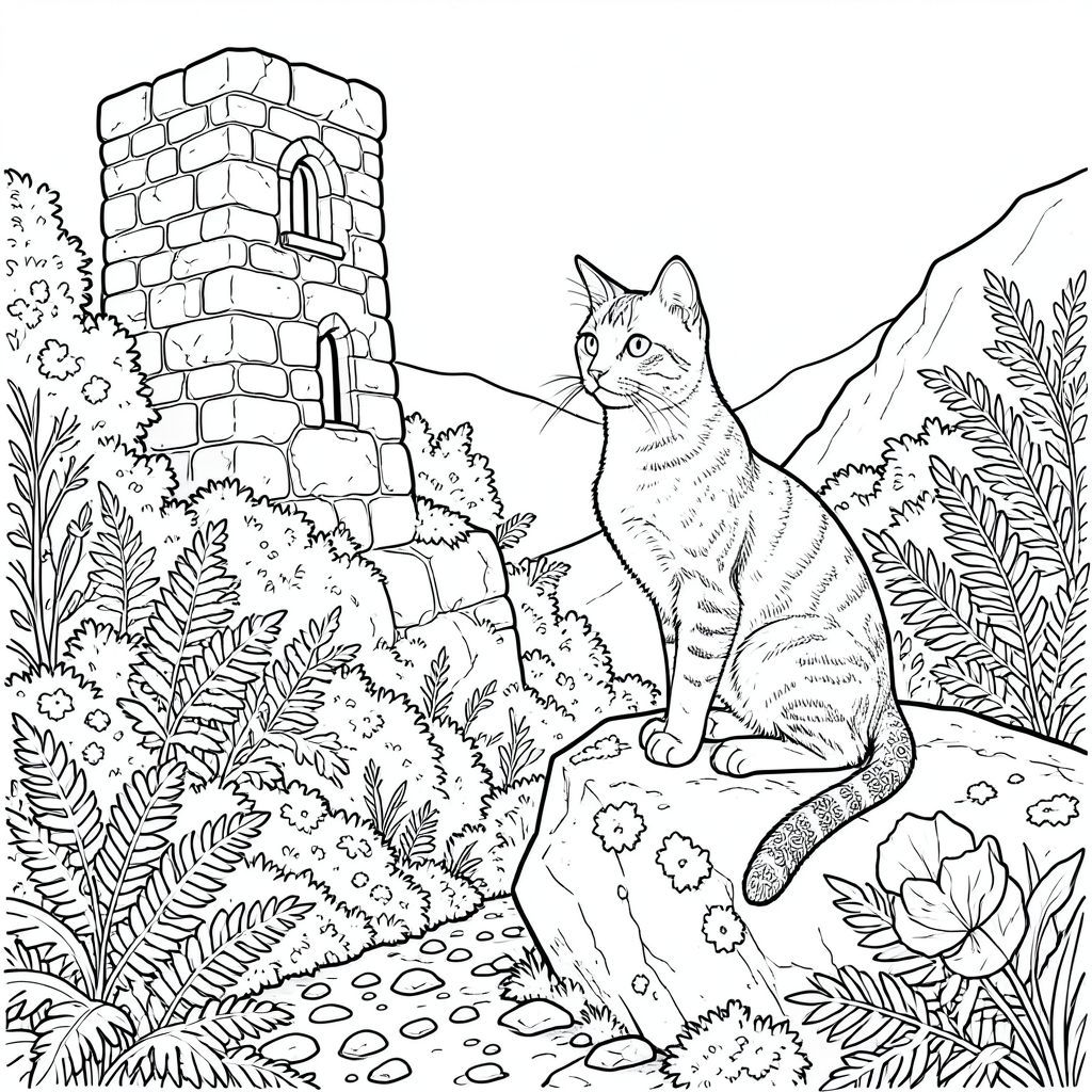 --- Giải thích về các lựa chọn và ý định thiết kế: * Tôi đã sử dụng các lớp cảnh quan - tháp đá, rêu, dương xỉ, hoa - để tạo ra cảm giác chiều sâu. Điều này khuyến khích mắt di chuyển và khám phá khung cảnh. * Địa y, đá không đều, sự thay đổi màu rêu – tất cả đều được chi tiết tỉ mỉ để tôn lên cảm giác "kiệt tác". Sự tương phản trong các đường nét là chìa khóa để đạt được tính thẩm mỹ mong muốn. * Tư thế của mèo cố tình bình tĩnh và chiêm nghiệm, tập trung sự chú ý của người xem. * Cố tình thiếu màu sắc là một hạn chế cơ bản. Nó hướng tất cả sự tập trung vào hình dạng của con vật. * Theo yêu cầu, toàn bộ hình ảnh được hiển thị trong , cung cấp độ tương phản mạnh.