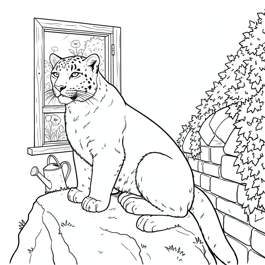 Hậu cảnh là một nền mềm, mờ , gợi ý một bầu trời hơi u ám. Trọng tâm hoàn toàn là con báo và khu vườn - một sự sắp xếp cẩn thận của các hình dạng và . Các đường viền được xác định với độ chính xác, gần như phẫu thuật, chính xác, nhấn mạnh hình dạng của con vật và tạo cảm giác chiều sâu. Chi tiết và cân nhắc chính: * Báo tuyết – Tập trung vào tư thế và kết cấu lông của nó. * Toàn bộ hình dạng của con báo được hiển thị rõ ràng, tạo ra sự tương phản mạnh mẽ. * Cửa sổ, cây anh túc, bình tưới nước và hàng rào đều góp phần tạo nên tâm trạng của khung cảnh - cảm giác tĩnh lặng và một chút u sầu. * Con báo ở giữa, nhưng hơi lệch tâm để tạo sự thú vị về thị giác. Hậu cảnh được cố tình làm mờ để thu hút sự chú ý vào đối tượng.