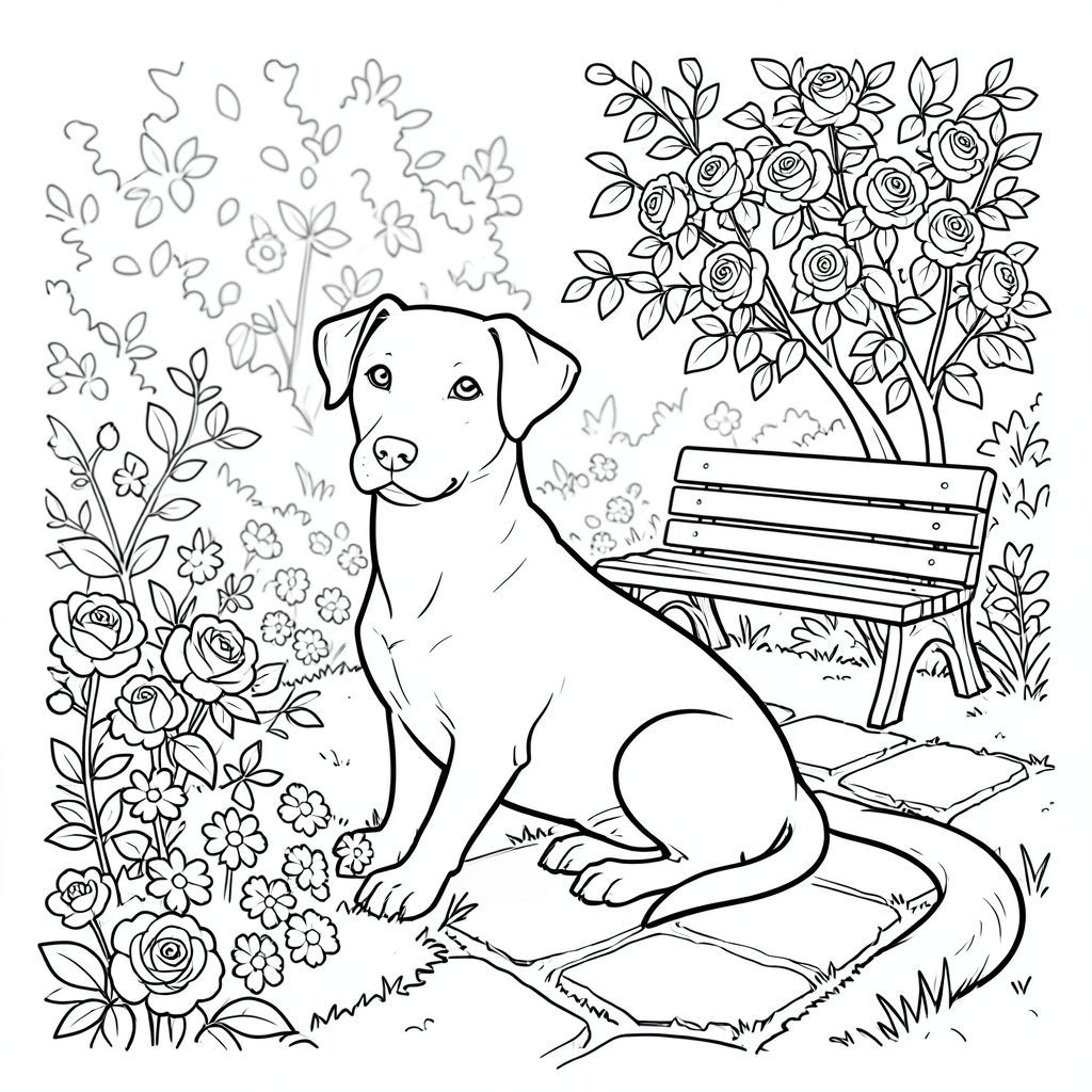 Dưới đây là mô tả về cảnh, nhằm vào phong cách và ràng buộc được yêu cầu. Tôi đã tập trung vào việc tạo ra một hình ảnh mạnh mẽ, tối giản với các yếu tố được chỉ định. Mô tả cảnh: Hình ảnh mô tả một chú chó đơn độc, bóng bẩy nép mình trong một khu vườn thu nhỏ, ngập tràn ánh nắng. được đặt hơi lệch tâm, với đầu và phần thân trên nghiêng về phía nền của những tán lá tươi tốt. Một con đường đá bị phong hóa, phủ đầy rêu uốn lượn qua khu vườn, dẫn đến một bồn hoa nhỏ, rực rỡ. Một chiếc ghế dài bằng gỗ cổ duy nhất nằm bên dưới một bụi hoa hồng trải dài, cánh hoa của nó là .