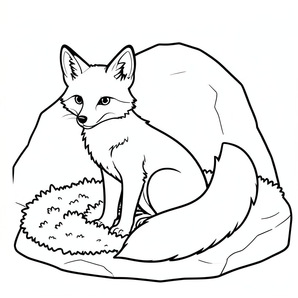 Dưới đây là mô tả về cảnh, tuân thủ tất cả các quy tắc và thông số kỹ thuật: Mô tả cảnh: Một con cáo duy nhất, bóng bẩy ngồi nép mình giữa một lớp rêu. Con cáo hơi quay mặt sang trái, quay đầu về phía người xem. Bộ lông của nó phong phú, ấm áp, và đuôi của nó dài và rậm rạp, uốn cong duyên dáng. Rêu cung cấp phông nền mềm mại, có kết cấu, làm mờ các cạnh của hình ảnh một cách tinh tế. Nền là một khối đá đơn giản, hơi có kết cấu, trong một , tắt tiếng. Con cáo là tiêu điểm duy nhất, được thể hiện với một đường viền đậm. Các yếu tố hình ảnh: * Một con cáo, một đầu, một đuôi, với một cái đuôi dài và rậm rạp. * Một thành tạo đá đơn giản, có kết cấu. * Một phác thảo duy nhất, đậm, của con cáo. * Không có màu. * Không có đột biến, nhiều đầu, nhiều đuôi, nhiều động vật, màu sắc, bóng râm.