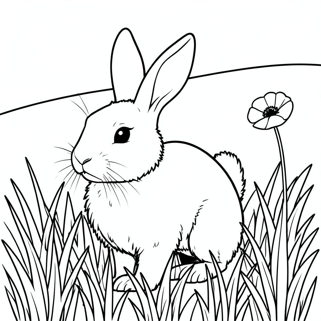 Dưới đây là mô tả về cảnh, tuân thủ tất cả các quy tắc và thông số kỹ thuật: Mô tả: Một con thỏ trắng lông tơ duy nhất đứng trên một cánh đồng cỏ cao. Con thỏ ở giữa, hơi hướng về bên trái. Tai của nó mềm và hơi nghiêng lên trên. Một bông hoa anh túc nhỏ, duy nhất được đặt ở bên phải của con thỏ, hơi mờ ở phía xa. Hậu cảnh là một ngọn đồi đơn giản, hơi có kết cấu. Các đường nét được in đậm và tạo ra một đường viền mạnh mẽ, rõ ràng. Bên trong màu trắng có thể nhìn thấy qua lông thỏ. Toàn bộ hình ảnh là một khung cảnh sạch sẽ, tối giản, chỉ tập trung vào con thỏ., trang tô màu đen trắng, phong cách lowbook, nghệ thuật đường nét, đơn sắc, không màu, không đổ bóng, không xám, không tô màu, nền trắng, đường viền đen đặc, độ tương phản đậm, đường nét sắc nét, chỉ phác thảo, phong cách vector, thiết kế phẳng, 2d, chính xác một đuôi đơn, hoàn toàn không tô màu đen, nội thất trắng tinh khiết, Không có miếng mực, không văn bản, không từ, không tiêu đề, hoàn toàn không màu, chỉ có lineart đen trắng thuần túy