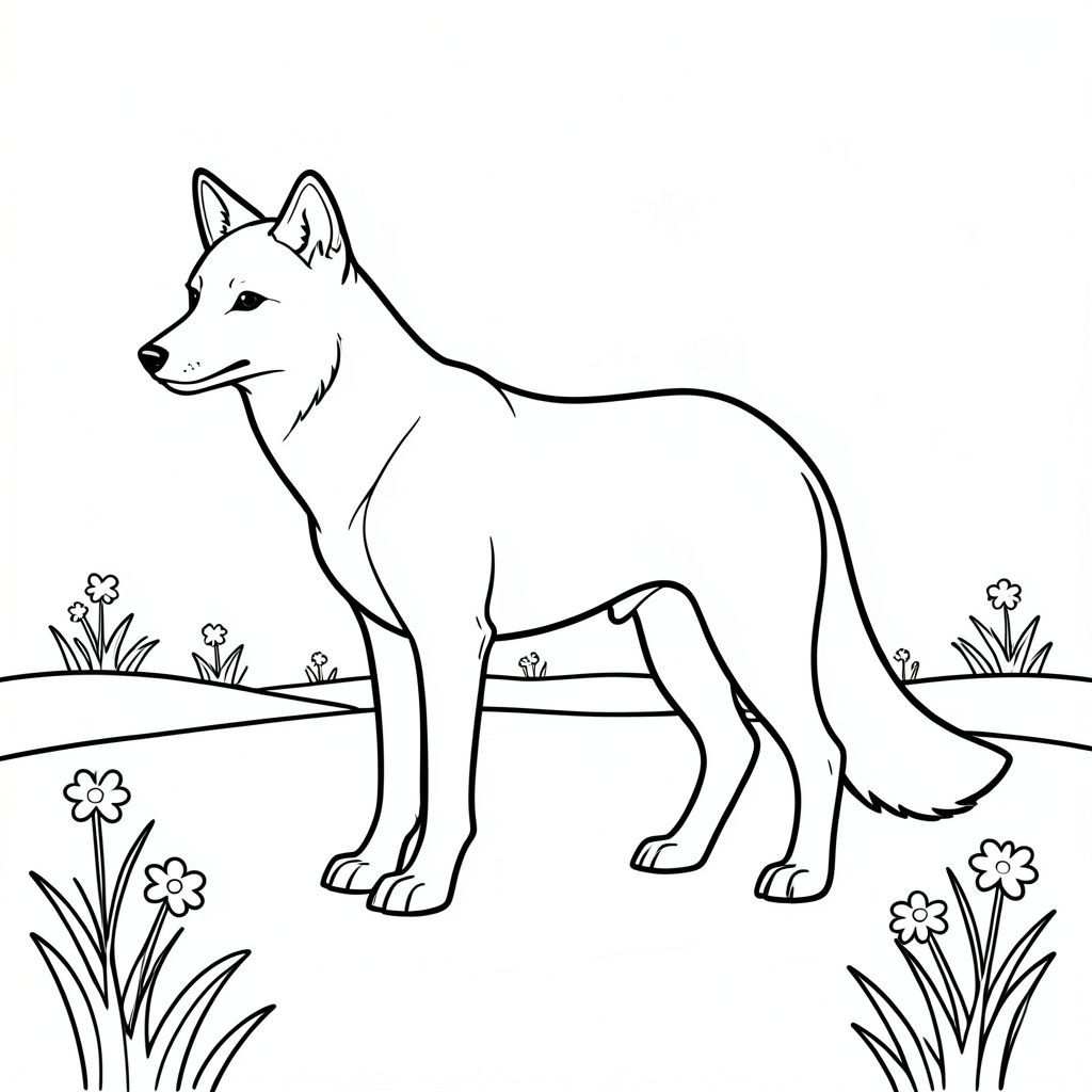Dưới đây là mô tả về cảnh, tuân thủ tất cả các quy tắc và thông số kỹ thuật: Sự miêu tả: Một con sói duy nhất, bóng bẩy, đứng trên đồng cỏ phủ đầy tuyết. Con sói ở giữa, hơi hướng về bên trái. Đầu của nó hơi hướng về phía trước, với một đường cong nhẹ nhàng đến hàm. Đuôi dài và thuôn nhọn, cong xuống dưới. Cơ thể của con sói thon dài và vạm vỡ, tạo thành một hình bóng đơn giản, mạnh mẽ. Đồng cỏ là một nơi im lặng, với một vài bông hoa dại nhỏ màu trắng rải rác có thể nhìn thấy từ xa. Nền là một đường đơn giản. Yếu tố hình ảnh: * Sói * Đồng cỏ đơn giản với một vài bông hoa dại rải rác. * Sạch sẽ, đậm, phác thảo. * Không có màu. * Không đổ bóng. * Không . * Con sói là một đại diện tối giản, chỉ tập trung vào hình dạng của nó.