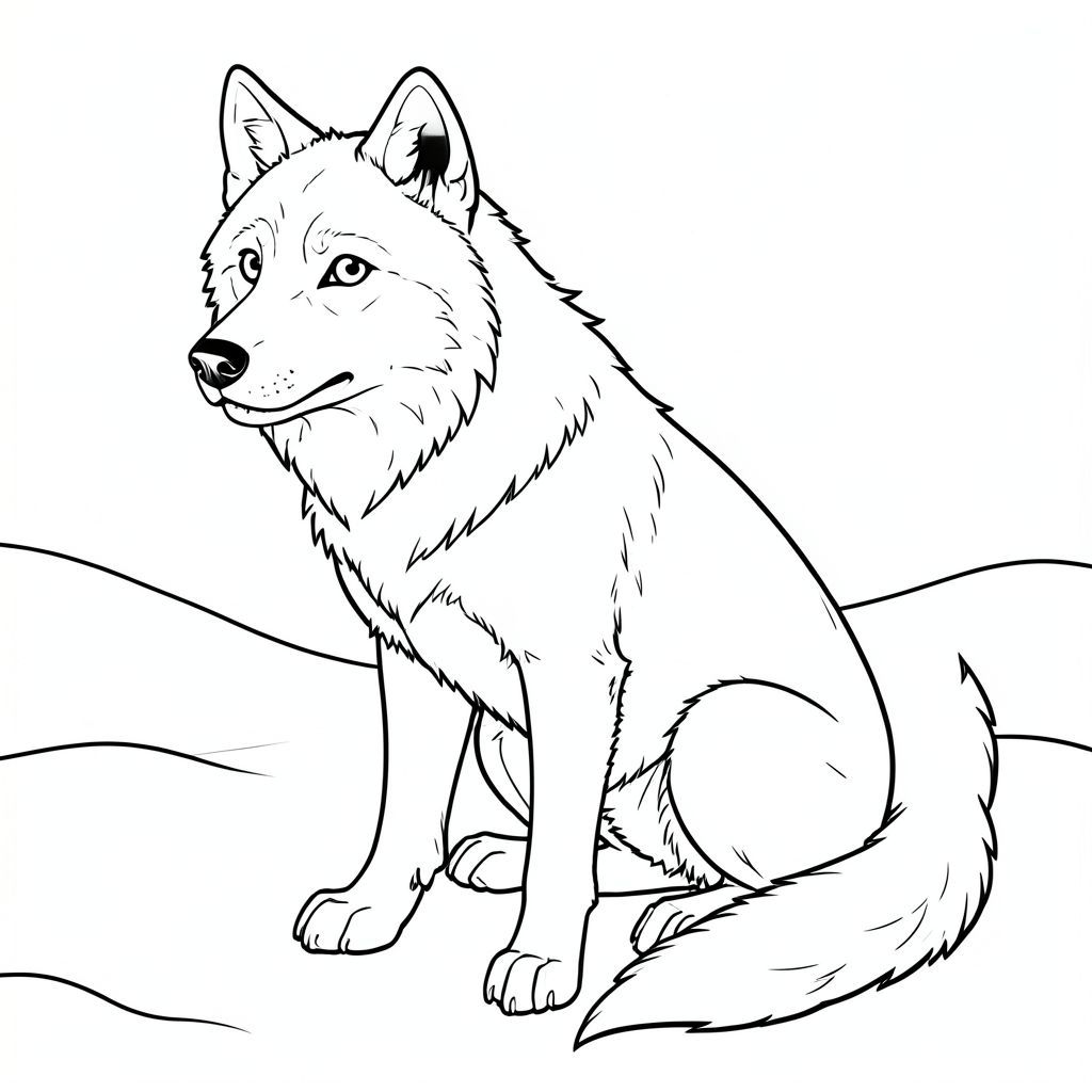 Dưới đây là mô tả về nghệ thuật đường nét đen trắng của một con vật có đặc điểm rõ ràng, thực tế, tuân thủ tất cả các quy tắc của bạn: Mô tả hình ảnh: Một con sói trưởng thành, hùng vĩ ngồi trong một bãi đất trống phủ đầy tuyết. Con sói được miêu tả trong một tư thế hơi góc cạnh, tự nhiên - lưng của nó hơi cong và đầu của nó hơi quay sang trái, hơi nhìn về phía trước. Đuôi của nó dài và rậm rạp, uốn cong duyên dáng xuống dưới. Con sói có lông mày nổi bật, hơi nhăn lại và biểu cảm dịu dàng, thông minh. Mũi của nó hơi ướt, và miệng hơi há hở, để lộ một chút răng trắng. Đôi mắt của con sói to và tập trung, với ánh sáng tinh tế. Bộ lông được hiển thị theo một mô hình chân thực, hơi nhẹ, với bóng mờ tinh tế để tạo chiều sâu. Bàn chân của sói lớn và có đệm, với các đường gờ tinh tế. Tuyết được khắc họa dưới dạng nền trắng mềm, hơi mờ, tạo cảm giác chiều sâu và khoảng cách. Ấn tượng tổng thể là một trong những sức mạnh yên tĩnh và vẻ đẹp tự nhiên. Các tính năng chính: * Sói * Tư thế thực tế, trưởng thành, hơi góc cạnh. * Lớn, mắt, mũi tinh tế và miệng hơi há hở. * Con sói được miêu tả chỉ có đuôi của nó. * Một nền trắng mềm mại. * Đường dày, đậm. * Đen trắng.