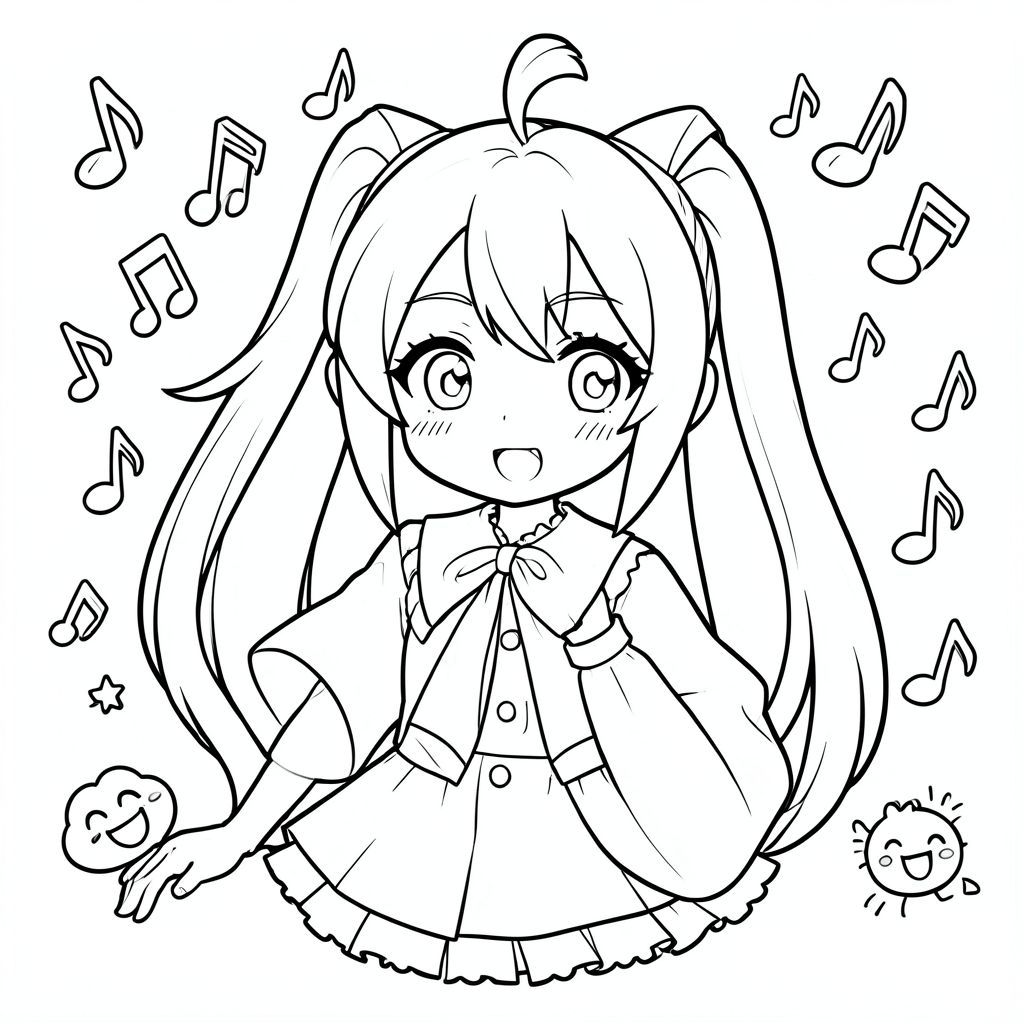 Hatsune Miku được bao quanh bởi những nốt nhạc và những nét vẽ nguệch ngoạc hạnh phúc
