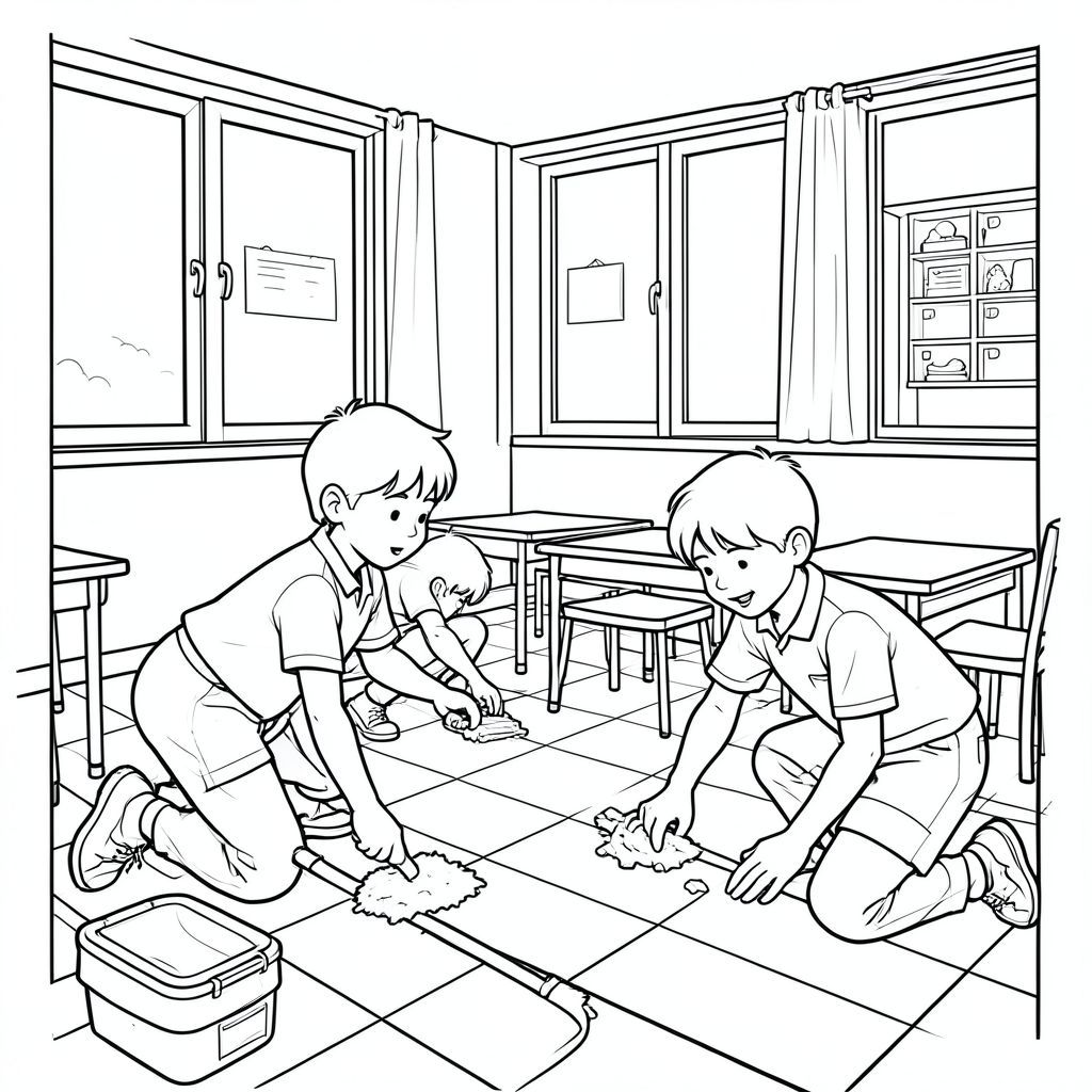 Học sinh lau sàn lớp học