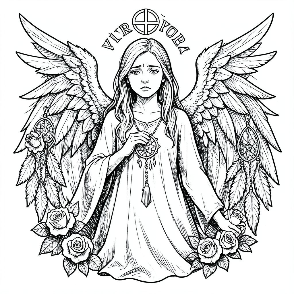 khắc gothic đen trắng, minh họa thực tế (không phải anime, không hoạt hình, không dễ thương), thiên thần phụ nữ buồn, tỷ lệ khuôn mặt tự nhiên, đôi cánh chi tiết, hoa hồng và dreamcatcher, biểu tượng Xử Nữ, bóng tối, Crosshatching, Đường phác thảo thô, phong cách cổ điển, không màu