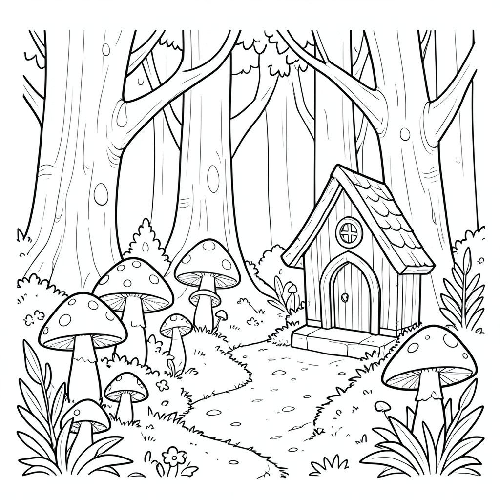 Khu rừng kỳ diệu với những cây nấm phát sáng và ngôi nhà cổ tích ẩn giấu, phong cách phác thảo bút chì