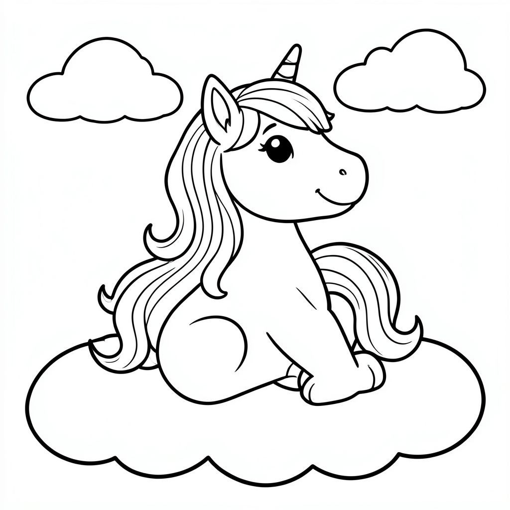 Kỳ lân hạnh phúc với bờm cầu vồng, ngồi trên mây và mây trên bầu trời, nghệ thuật đường nét, dành cho trẻ em tô màu"