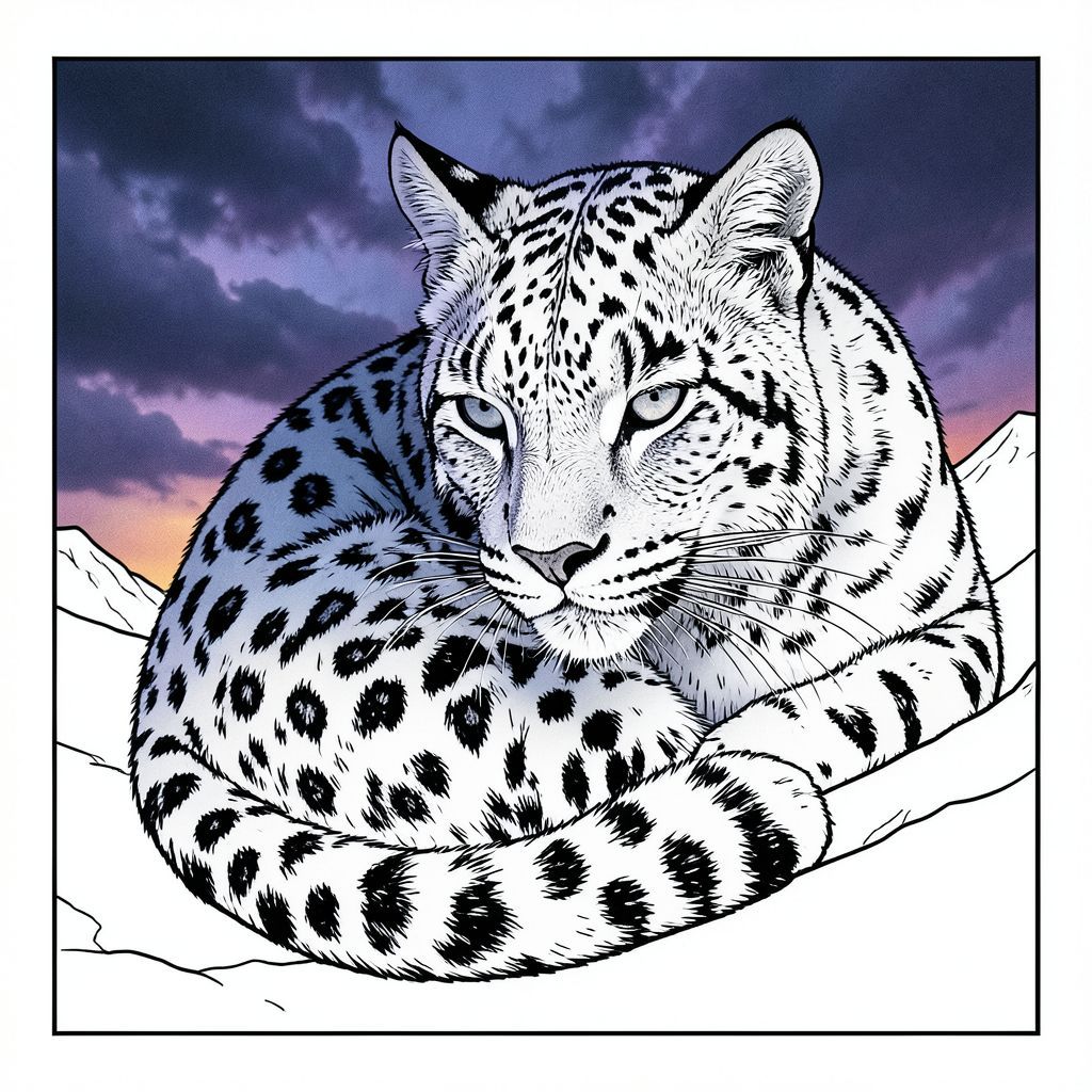 Bức ảnh điện ảnh, siêu thực về một con báo tuyết, hình bóng trên bầu trời chạng vạng nhuốm màu tím đầy bão tố. Tập trung vào tư thế cuộn tròn, ánh mắt tập trung cao độ. Ánh sáng dịu nhẹ, khuếch tán - chủ yếu là màu xanh lam mát mẻ, màu tím đậm và một chút hổ phách ấm áp - tạo ra một tâm trạng huyền bí, hơi u sầu. Mô phỏng kho phim hạt, gợi nhớ đến nhiếp ảnh thời kỳ đầu. Độ sâu trường ảnh nên nhấn mạnh khuôn mặt của con báo, tạo cảm giác cô lập và sức mạnh nguyên thủy. Kết cấu cực kỳ chi tiết - lông thú, tuyết - là rất quan trọng.