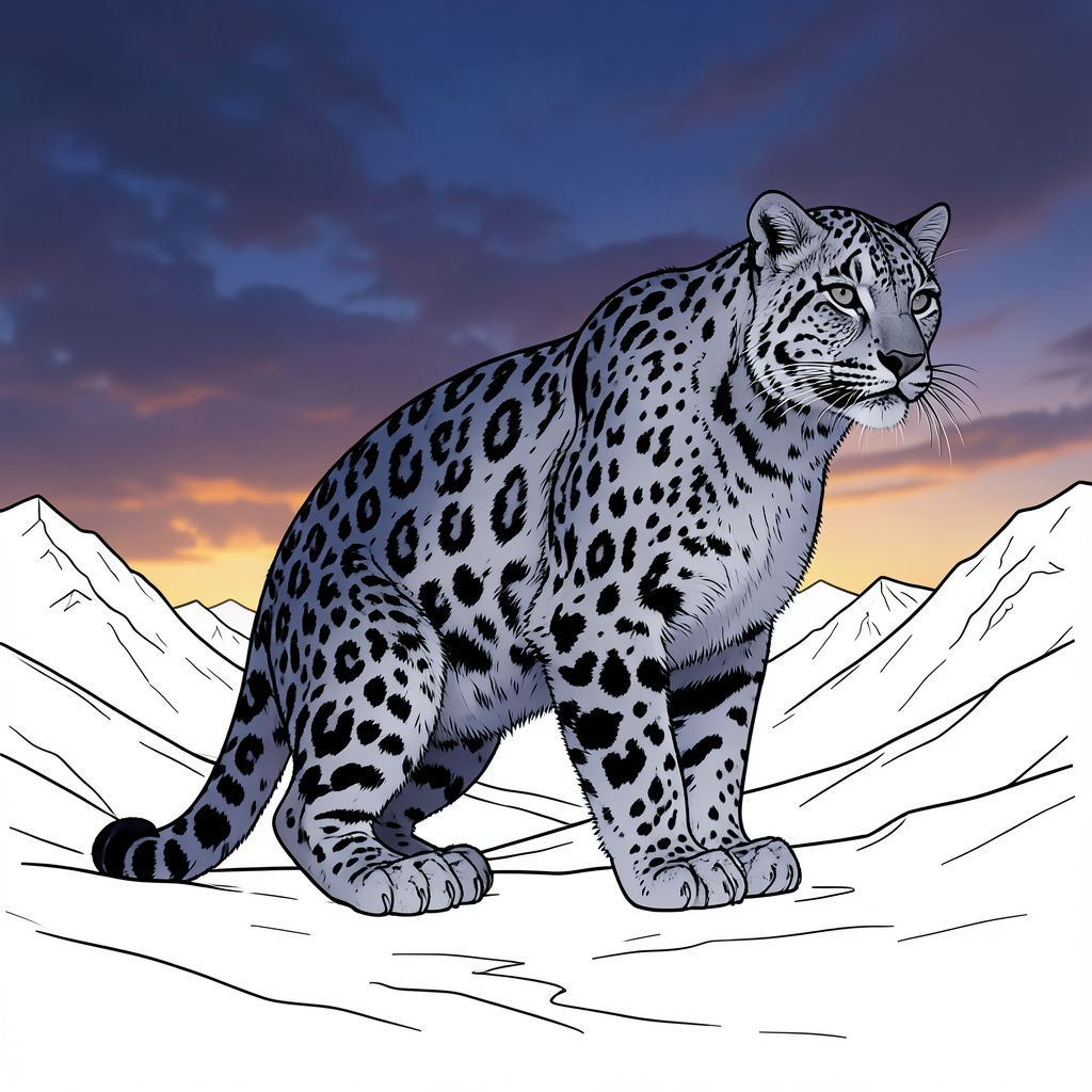 Tạo hình ảnh siêu thực về một con báo tuyết, kẻ săn mồi đỉnh cao, hình bóng trên bầu trời chạng vạng ấn tượng. Ánh sáng ở góc thấp, sử dụng ánh sáng ấm áp, nhuốm màu cam từ một dãy núi mờ mịt ở xa. Bảng màu: xanh đậm, tím và một chút đất son ấm áp cho tuyết. Trọng tâm là kết cấu - bộ lông bóng bẩy, móng vuốt sắc nhọn và cảm giác mạnh mẽ và tĩnh lặng có thể sờ thấy được. Tâm trạng: u sầu, hùng vĩ và hơi bí ẩn. Độ chi tiết cao, độ phân giải 8k.