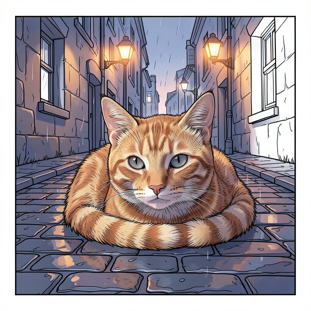 Tạo ra một hình ảnh siêu thực, hơi u sầu của một con mèo mướp gừng nép mình trong một con hẻm lát đá cuội đầy mưa vào lúc chạng vạng. Ánh sáng vàng dịu nhẹ, khuếch tán làm nổi bật bộ lông của mèo và đôi mắt xám khói tinh tế. Con hẻm được thắp sáng lờ mờ bởi đèn đường tông màu cam ấm áp phản chiếu trên đá ướt. Bảng màu: xanh chàm đậm, đất nung trầm và một chút hoa hồng bụi. Tâm trạng: chiêm nghiệm, hơi cô đơn, gợi lên một khoảnh khắc cô đơn yên tĩnh. Tập trung vào kết cấu - bộ lông, đá cuội, mưa. Độ phân giải 8K, ánh sáng điện ảnh.