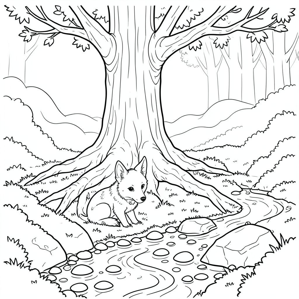 Một nhỏ, trắng như tuyết, có kích thước gần bằng một con cáo, ngồi nép mình bên dưới những rễ cây sồi trải dài. Bộ lông của nó có màu trắng nguyên sơ, gần như rực rỡ, bắt được những hoa văn xoáy tinh tế. Đuôi của nó, dài và hơi cong, kéo dài phía sau nó như một dải ruy băng ánh trăng. Tai của nó, nhỏ và nhọn, được gập xuống, gợi ý một sự tĩnh lặng, cảnh giác. Một chiếc mũi nhung duy nhất được ép vào mặt đất ẩm ướt và mát mẻ. Ánh mắt của dán chặt vào một làn sương xoáy xa xôi che khuất bìa rừng., trang màu, nghệ thuật đường nét, nền trắng